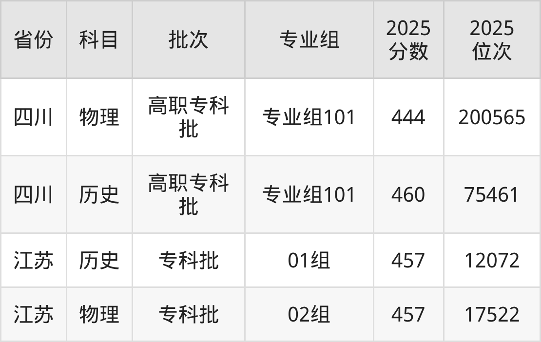 2025年在专科物理类进行招生,各专业组分数线详情如下: