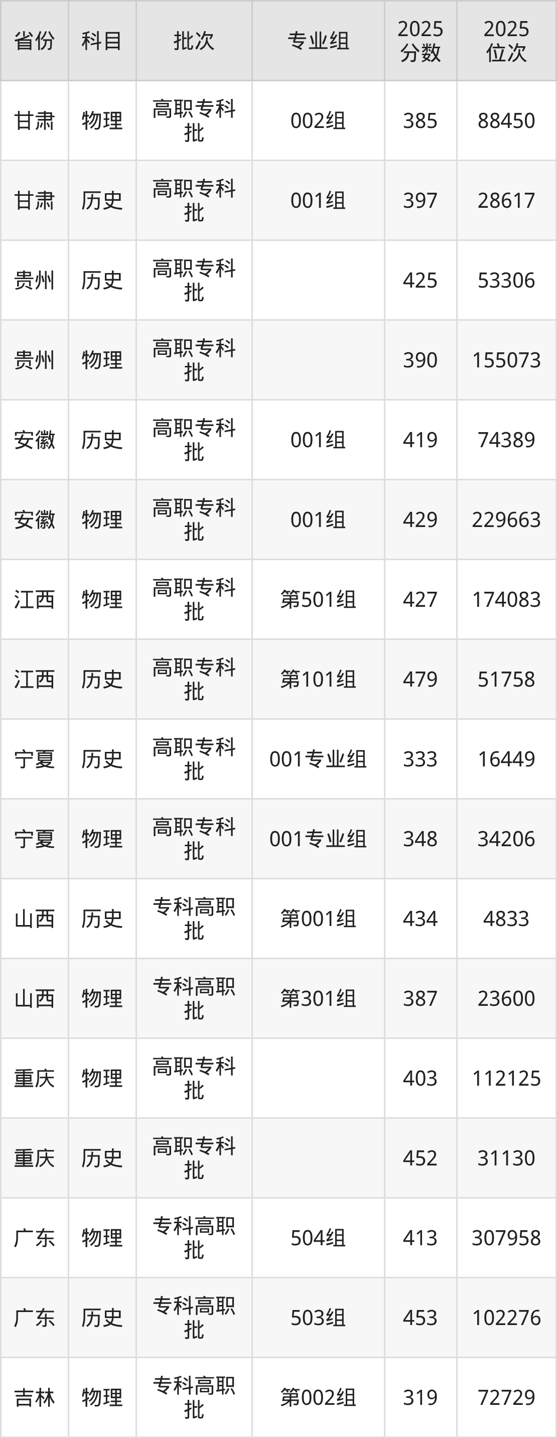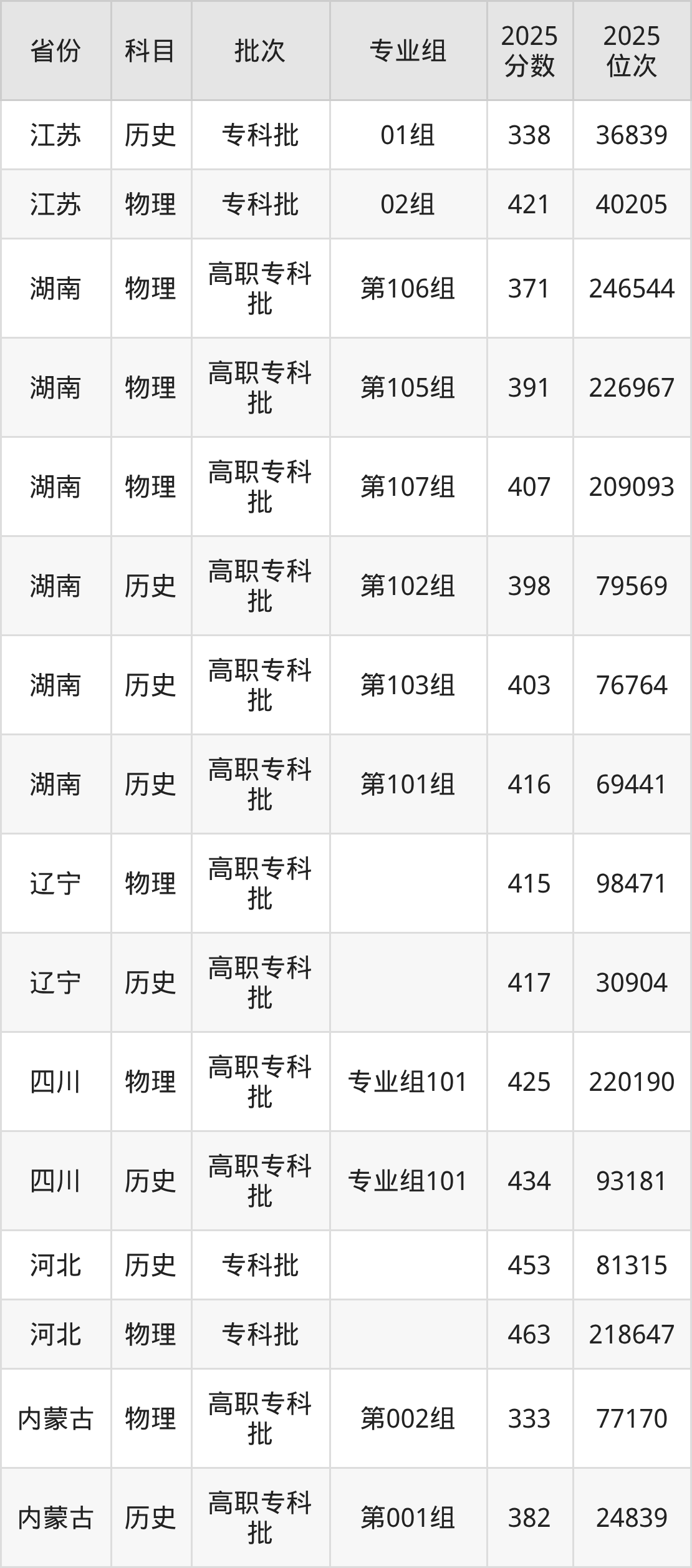 2025年湖南交通职业技术学院全国录取分数线是319分到479分,录取最低在吉林物理类(第002组)、录取最高在江西历史类(第101组)。各省各专业组最低分具有差异,详情如下: