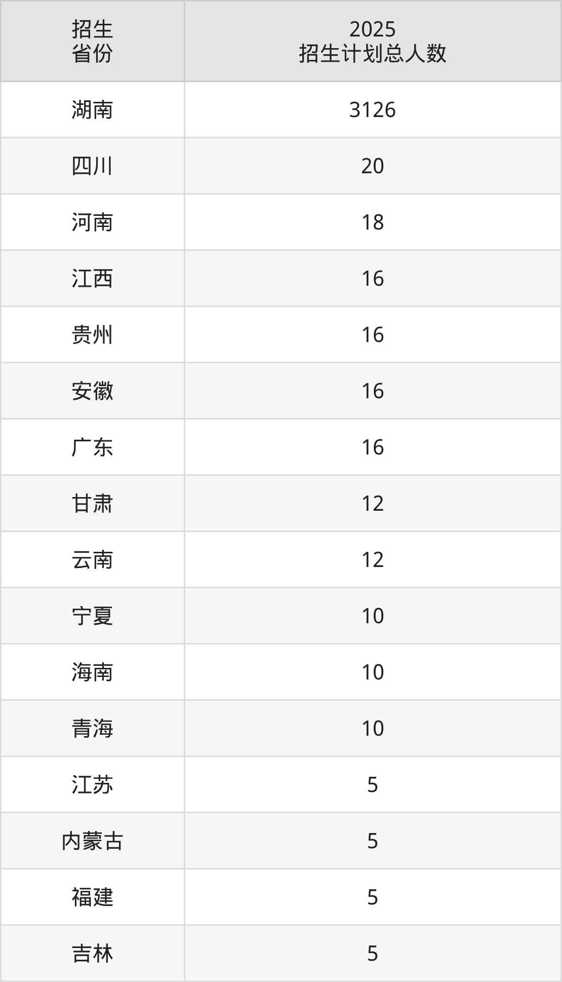 2025年湖南交通职业技术学院面向全国20个省市开展专科招生;招生专业共35个,招生人数共3321人。2025年在湖南省招生计划总人数是3126人,其中,湖南交通职业技术学院在湖南省招生人数最多的是道路与桥梁工程技术。湖南交通职业技术学院在各省具体招生人数情况如下表。