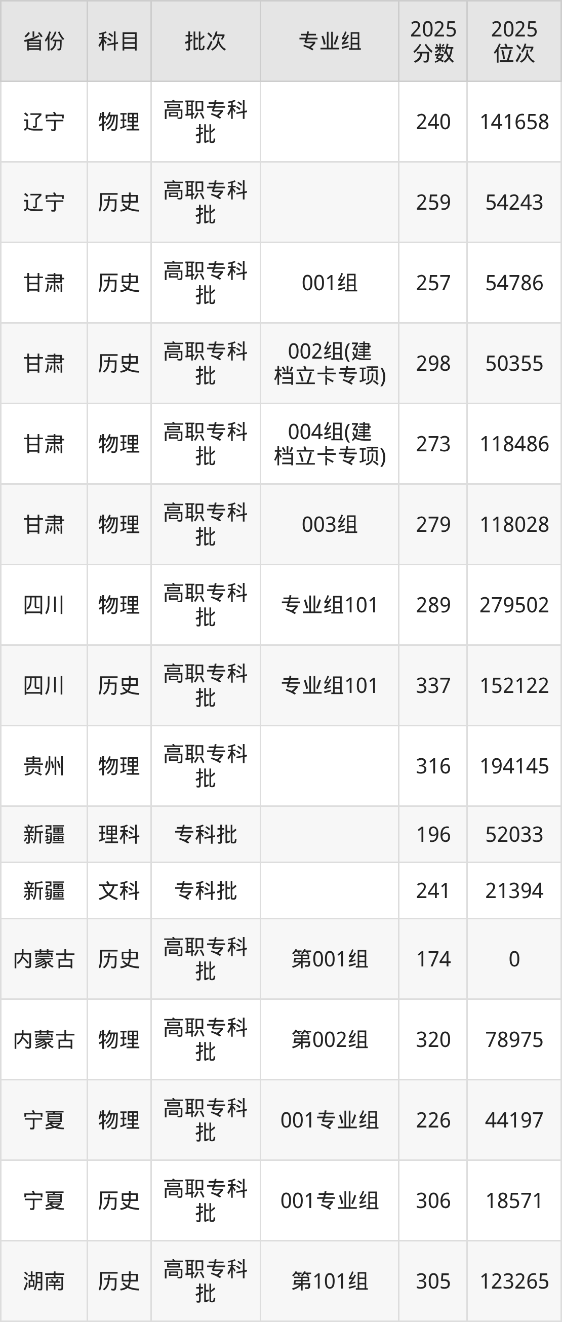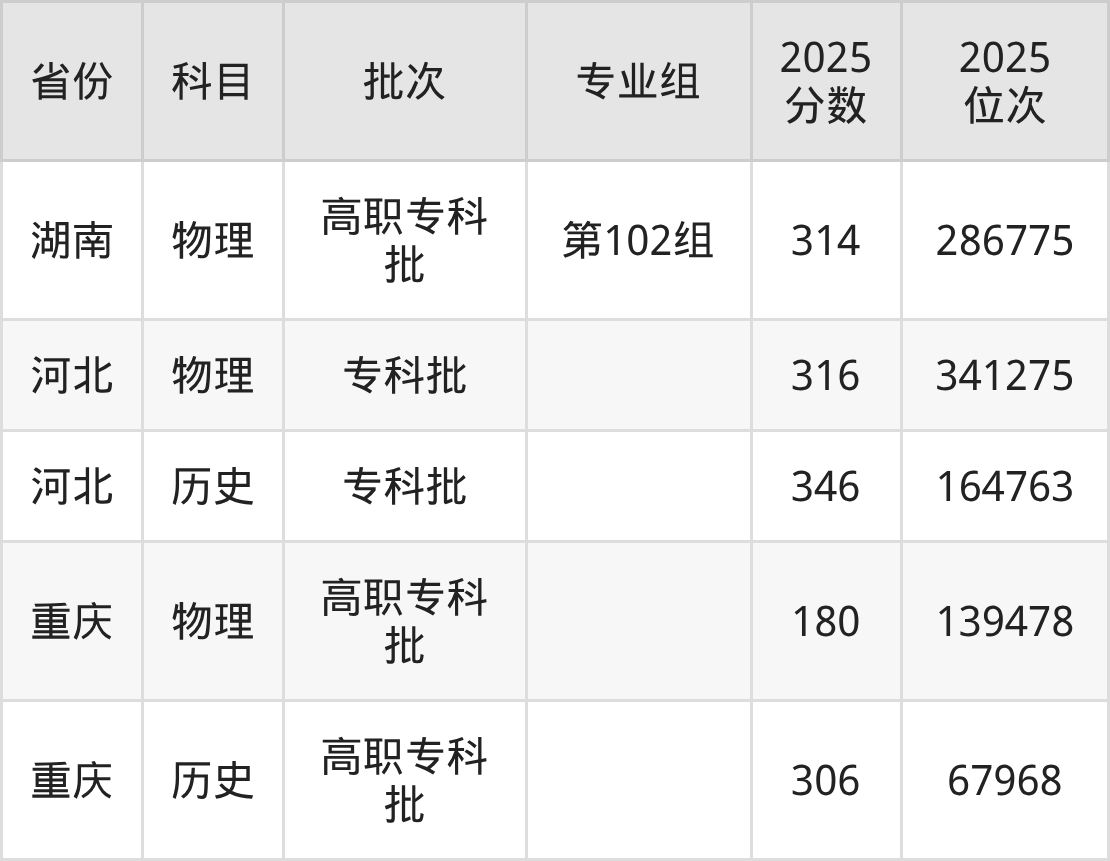 2025年在专科物理类进行招生,各专业组分数线详情如下: