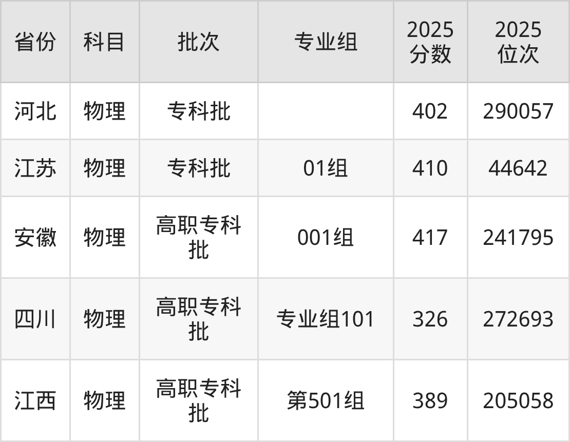 2025年在专科物理类进行招生,各专业组分数线详情如下: