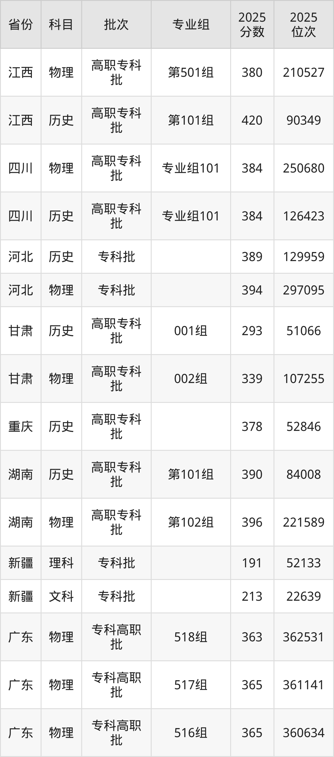 普通类专科物理类最低363分,专科历史类最低408分