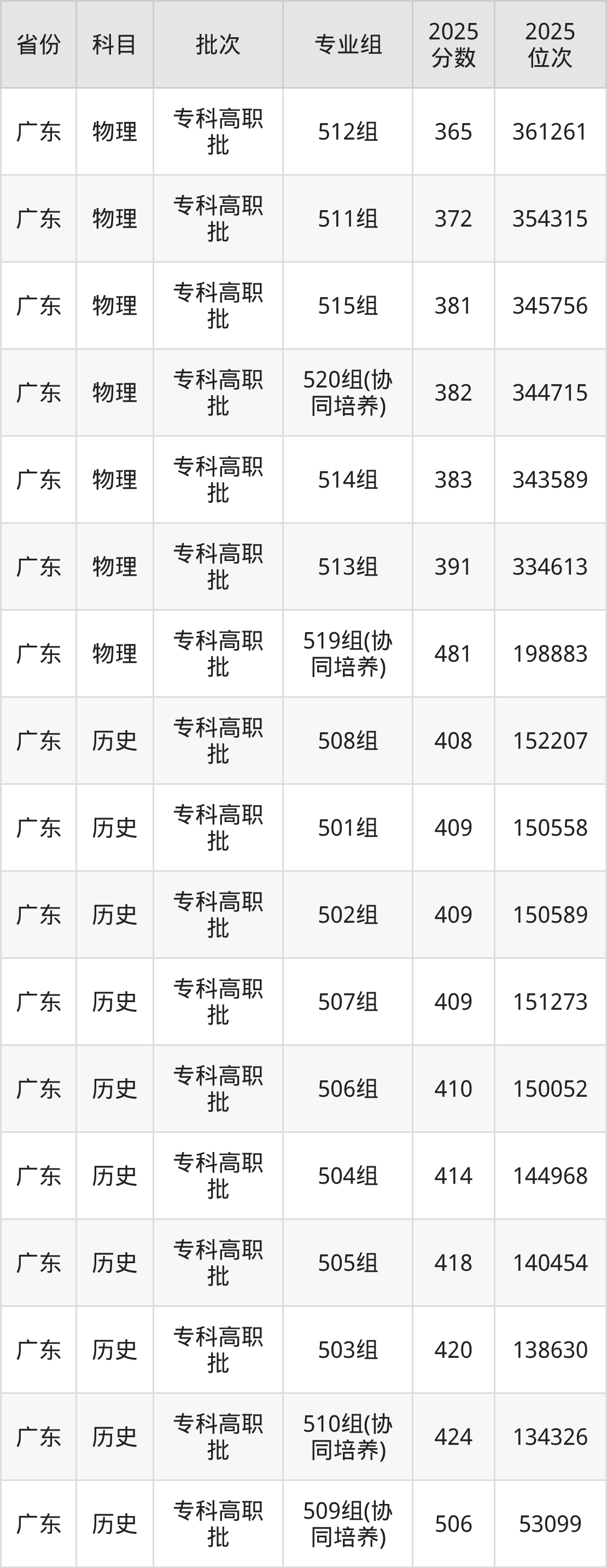 2025年在专科历史类进行招生,各专业组分数线详情如下:
