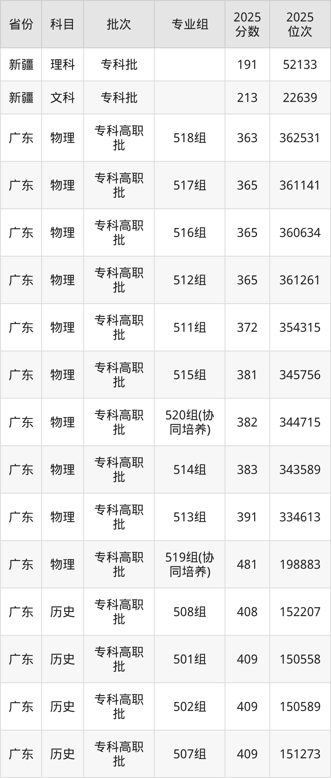 2025年茂名职业技术学院全国录取分数线是191分到506分,录取最低在新疆理科、录取最高在广东历史类(509组(协同培养))。各省各专业组最低分具有差异,详情如下: