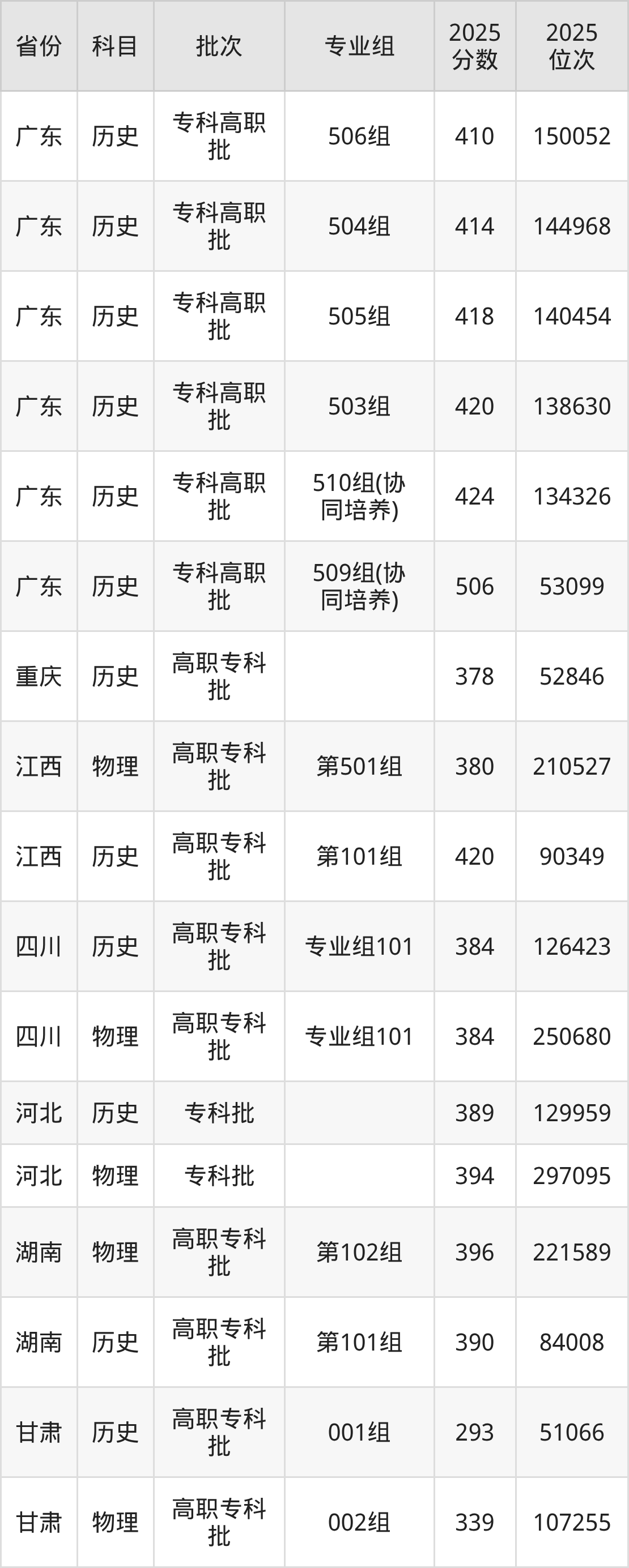 普通类专科历史类最低293分,专科物理类最低339分