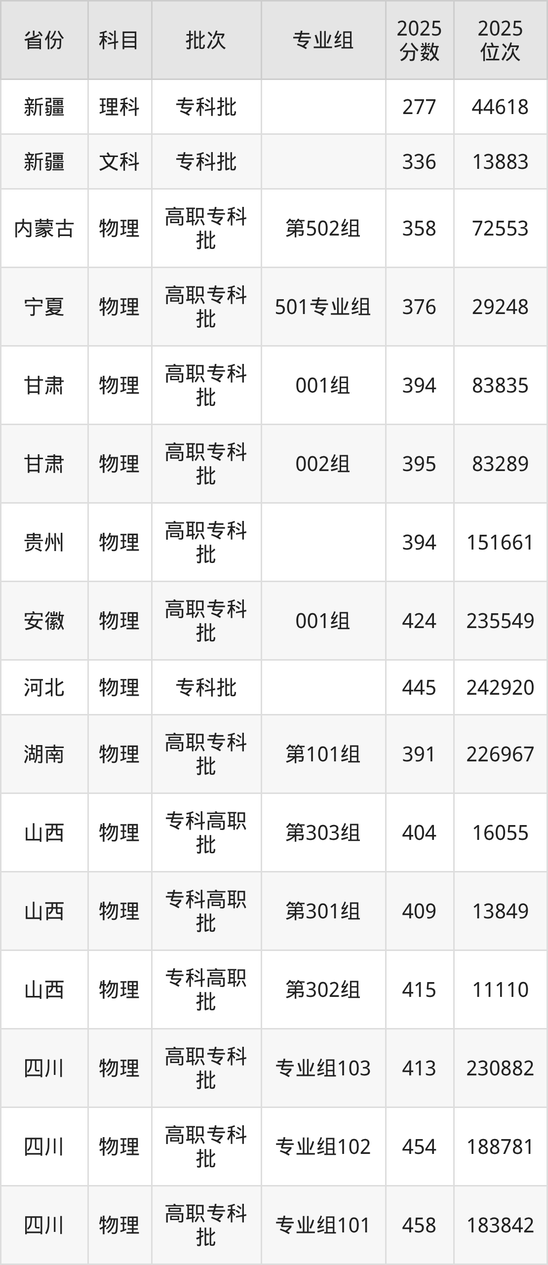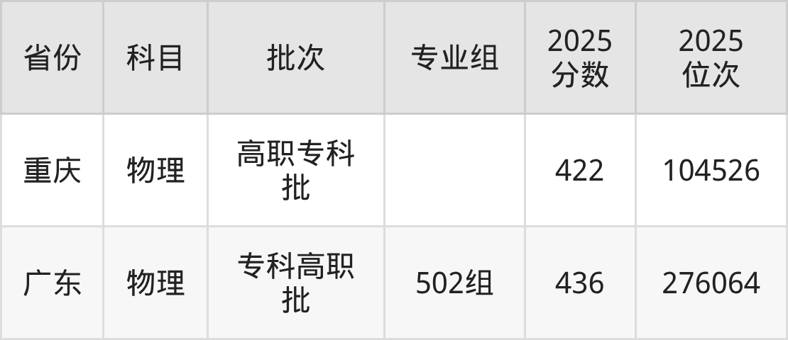 2025年在专科物理类进行招生,各专业组分数线详情如下: