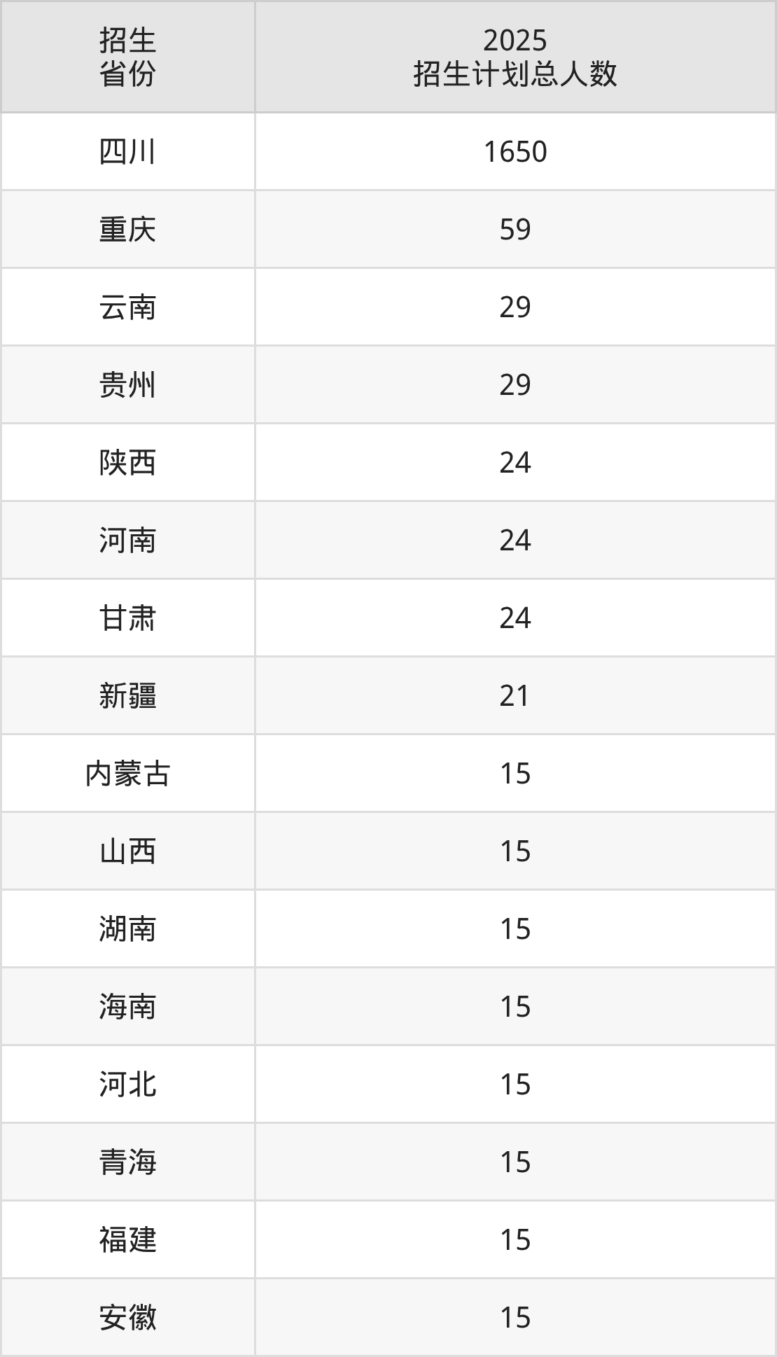 2025年四川中医药高等专科学校面向全国18个省市开展专科招生;招生专业共14个,招生人数共2002人。2025年在四川省招生计划总人数是1650人,其中,四川中医药高等专科学校在四川省招生人数最多的是护理。四川中医药高等专科学校在各省具体招生人数情况如下表。