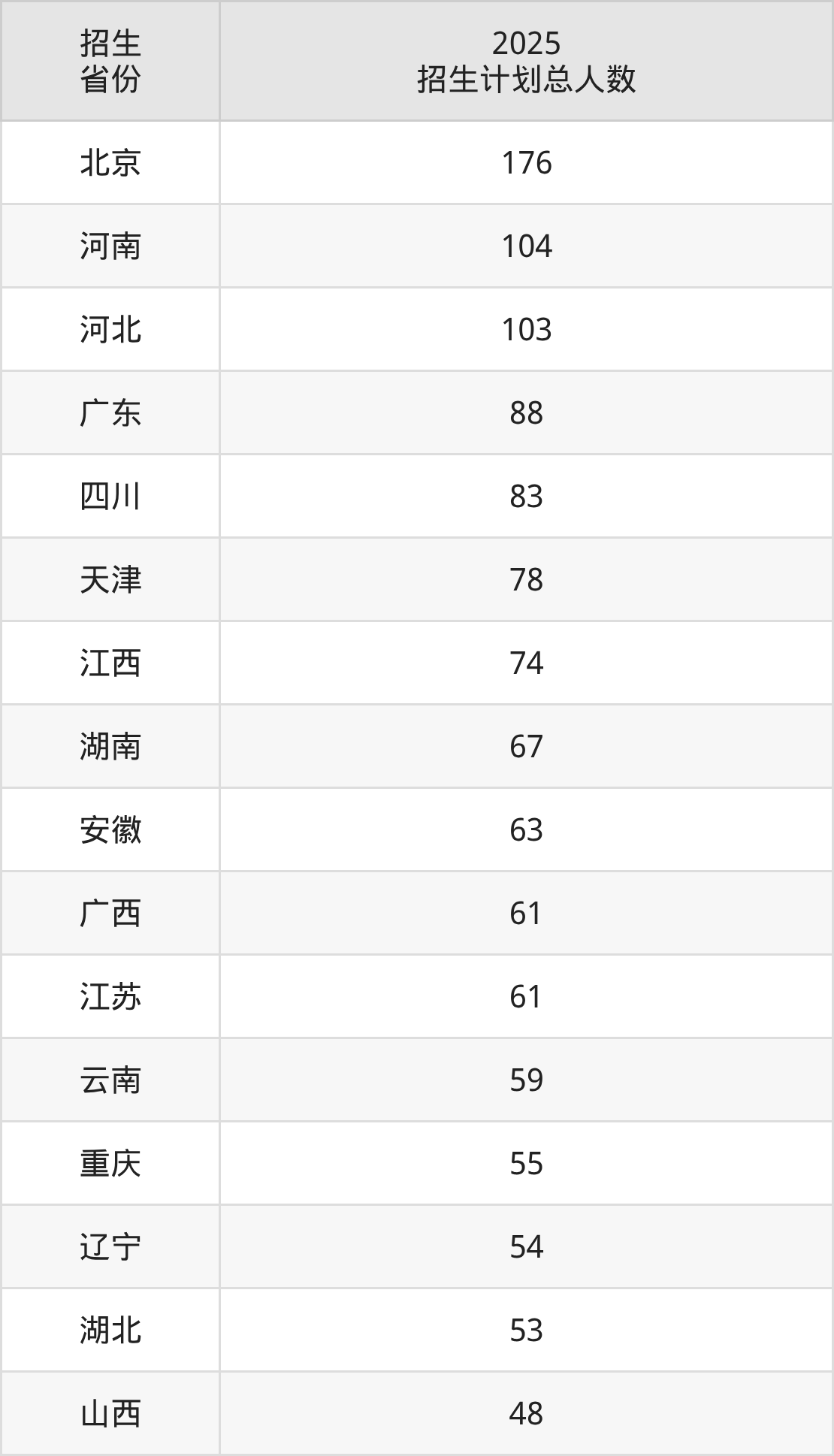 2025年北京语言大学面向全国26个省市开展本科招生;招生专业共26个,招生人数共1533人。2025年在北京市招生计划总人数是176人,其中,北京语言大学在北京市招生人数最多的是外国语言文学类。北京语言大学在各省具体招生人数情况如下表。