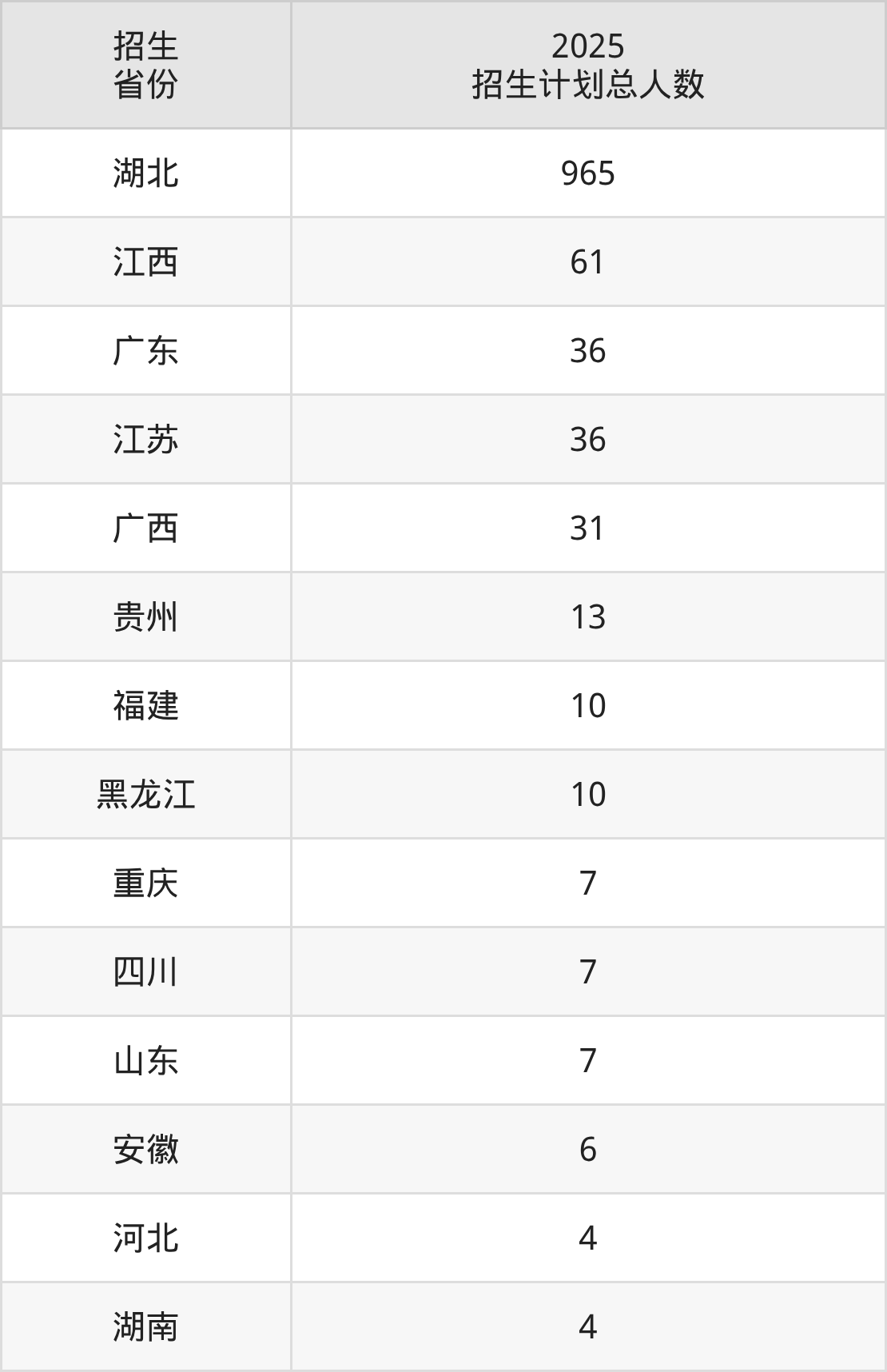2025年武汉传媒学院面向全国14个省市开展本科招生;招生专业共16个,招生人数共1197人。2025年在湖北省招生计划总人数是965人,其中,武汉传媒学院在湖北省招生人数最多的是网络与新媒体。武汉传媒学院在各省具体招生人数情况如下表。