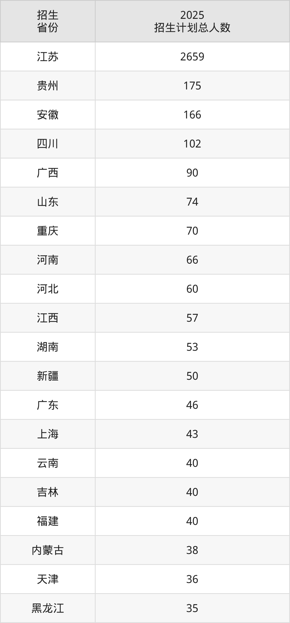2025年南京财经大学面向全国29个省市开展本科招生;招生专业共38个,招生人数共4087人。2025年在江苏省招生计划总人数是2659人,其中,南京财经大学在江苏省招生人数最多的是工商管理类。南京财经大学在各省具体招生人数情况如下表。