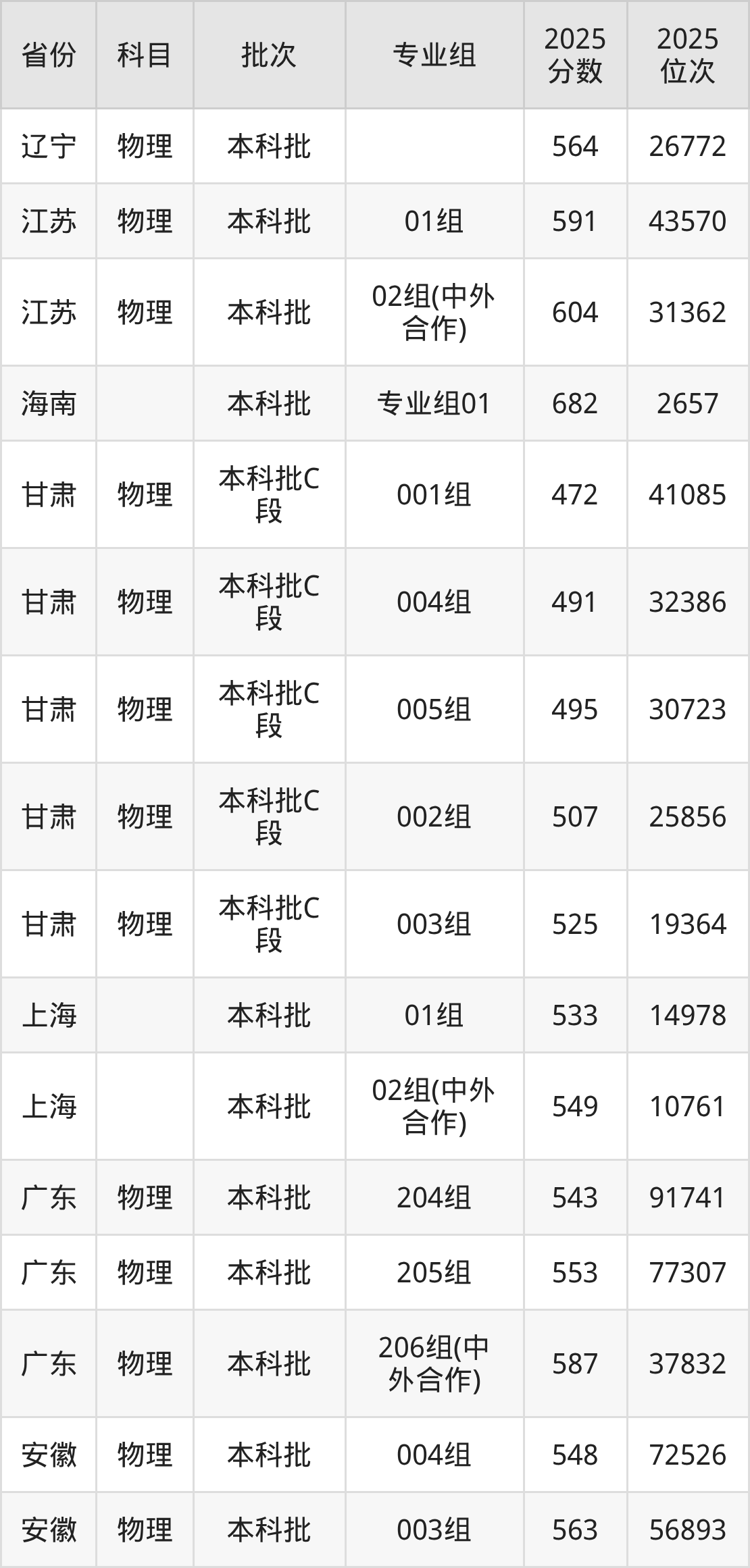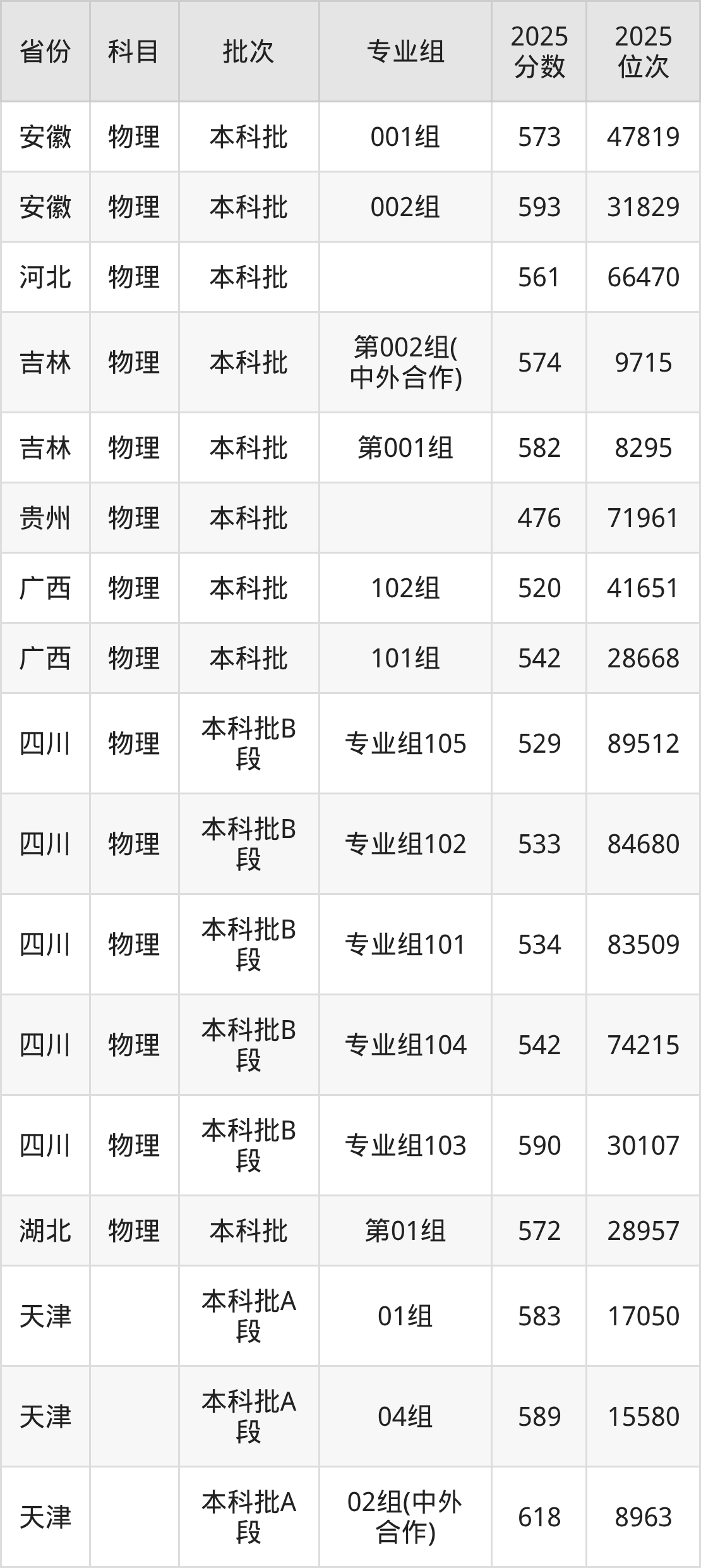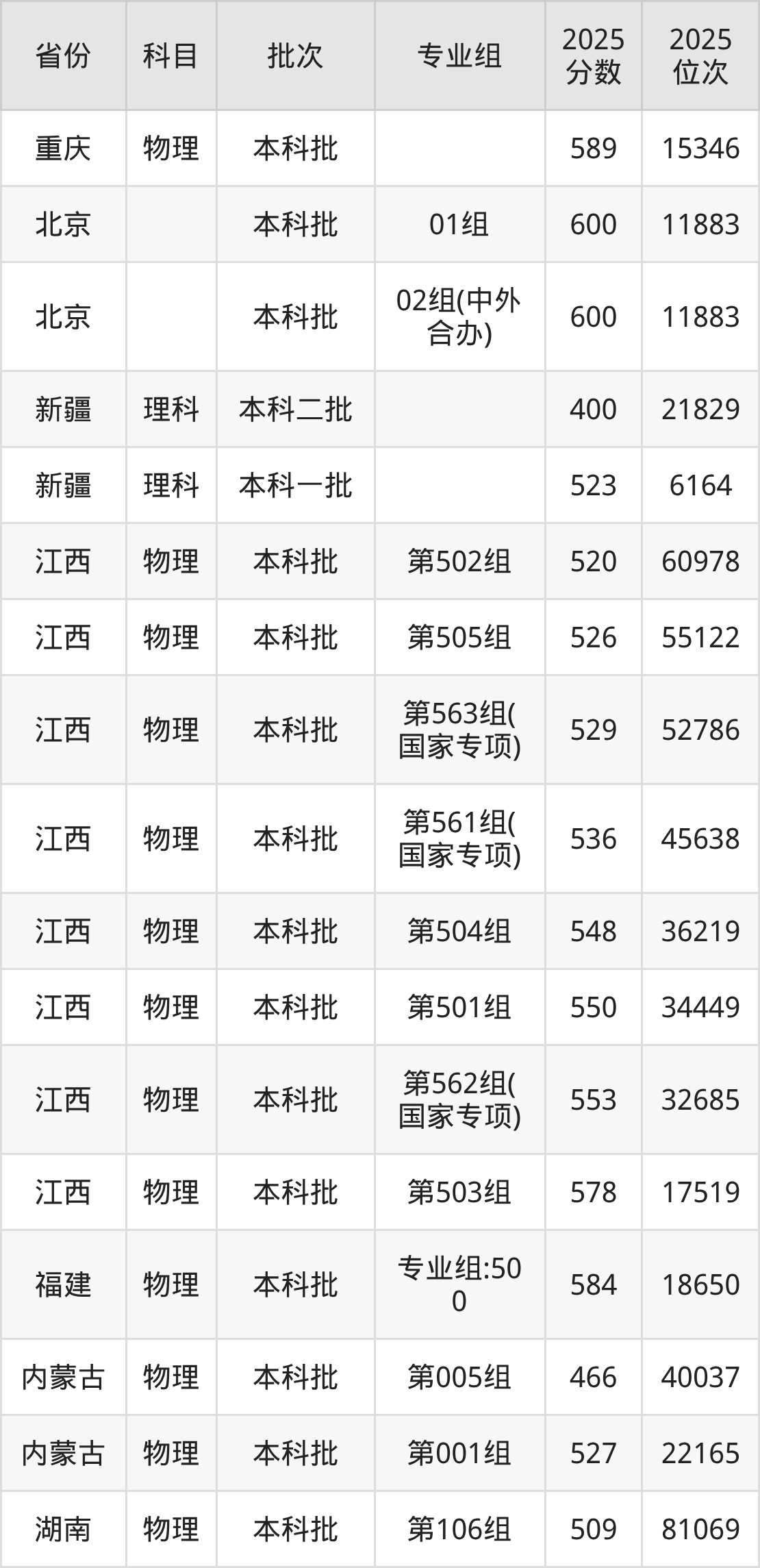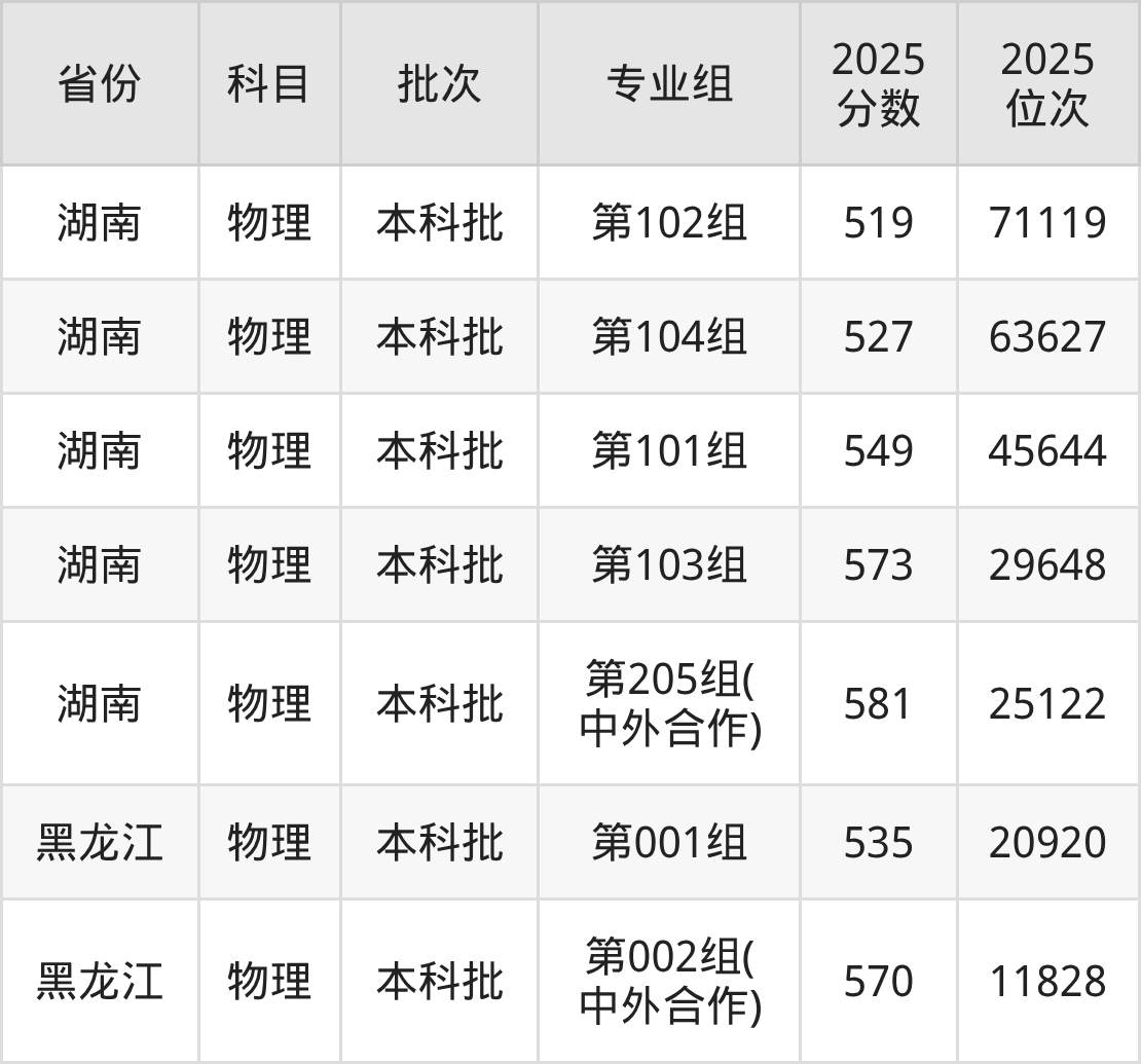 2025年在本科物理类进行招生,各专业组分数线详情如下: