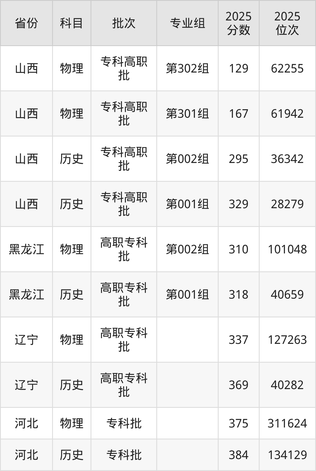 普通类专科物理类最低129分,专科历史类最低295分