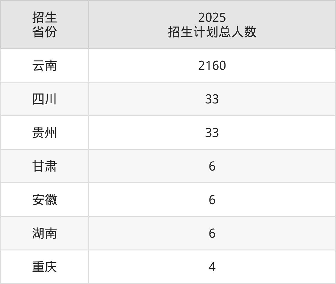 2025年昆明工业职业技术学院面向全国7个省市开展专科招生;招生专业共46个,招生人数共2248人。2025年在云南省招生计划总人数是2160人,其中,昆明工业职业技术学院在云南省招生人数最多的是学前教育。昆明工业职业技术学院在各省具体招生人数情况如下表。