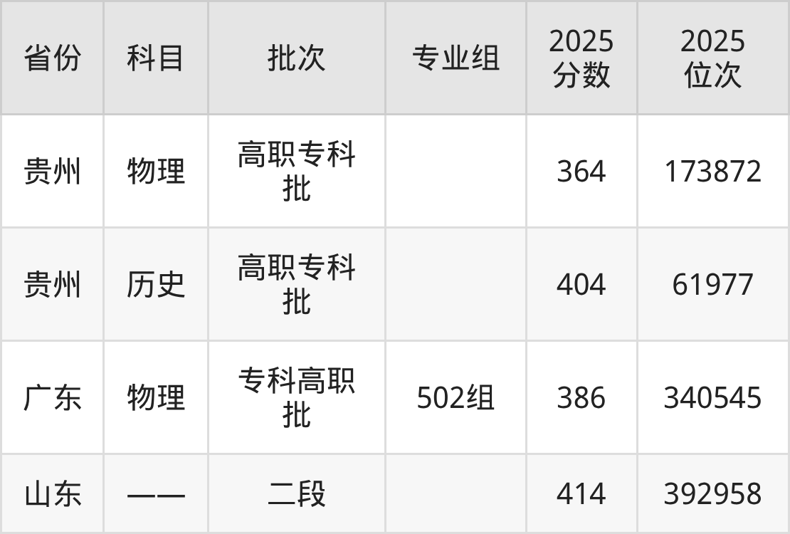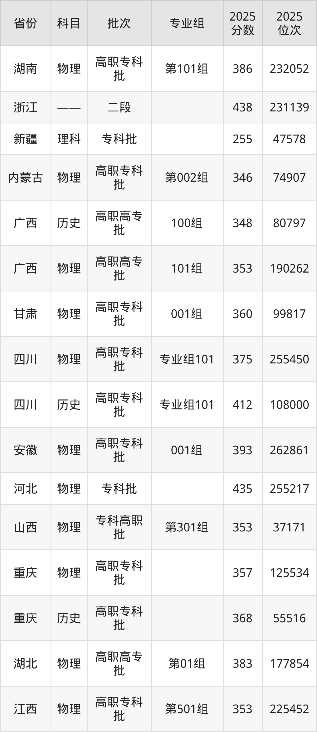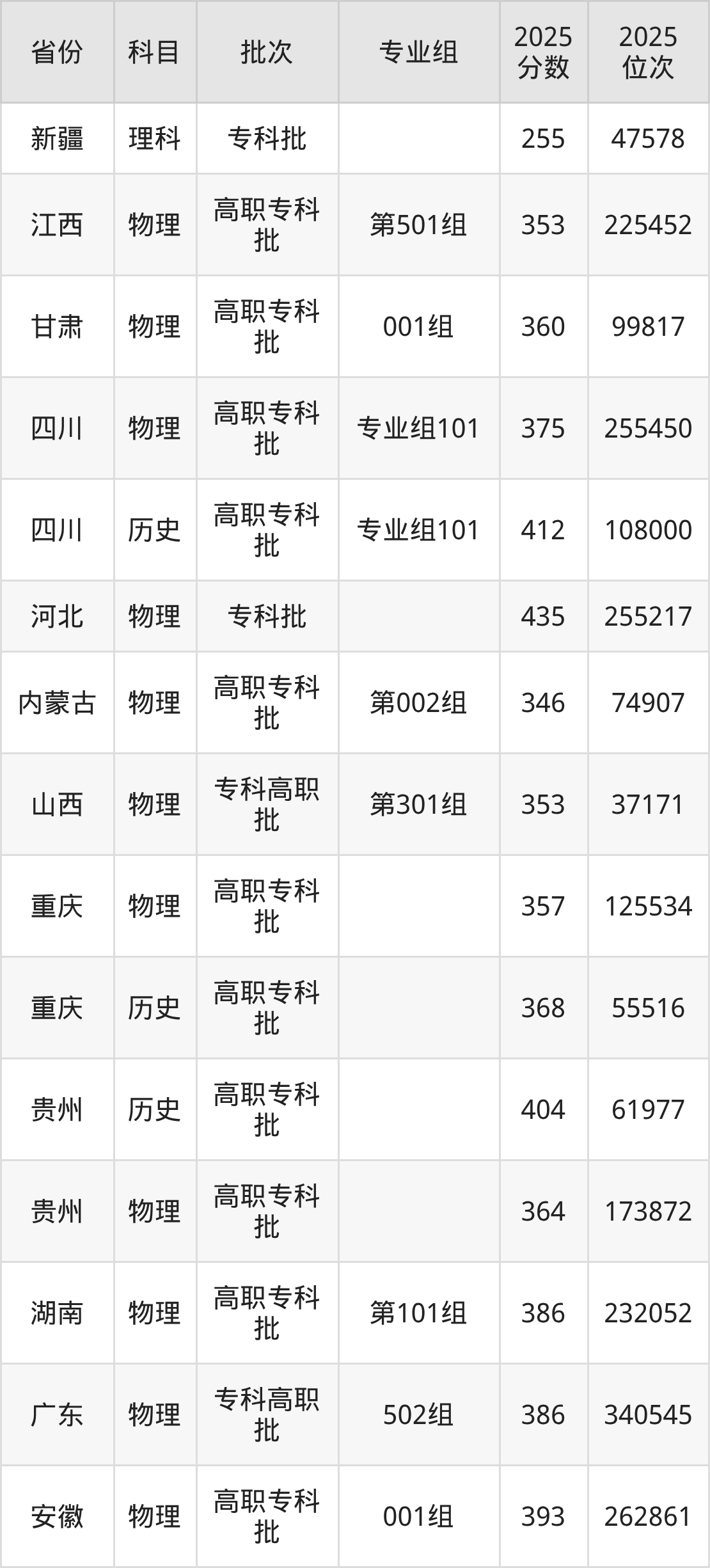 2025年在专科物理类进行招生,各专业组分数线详情如下: