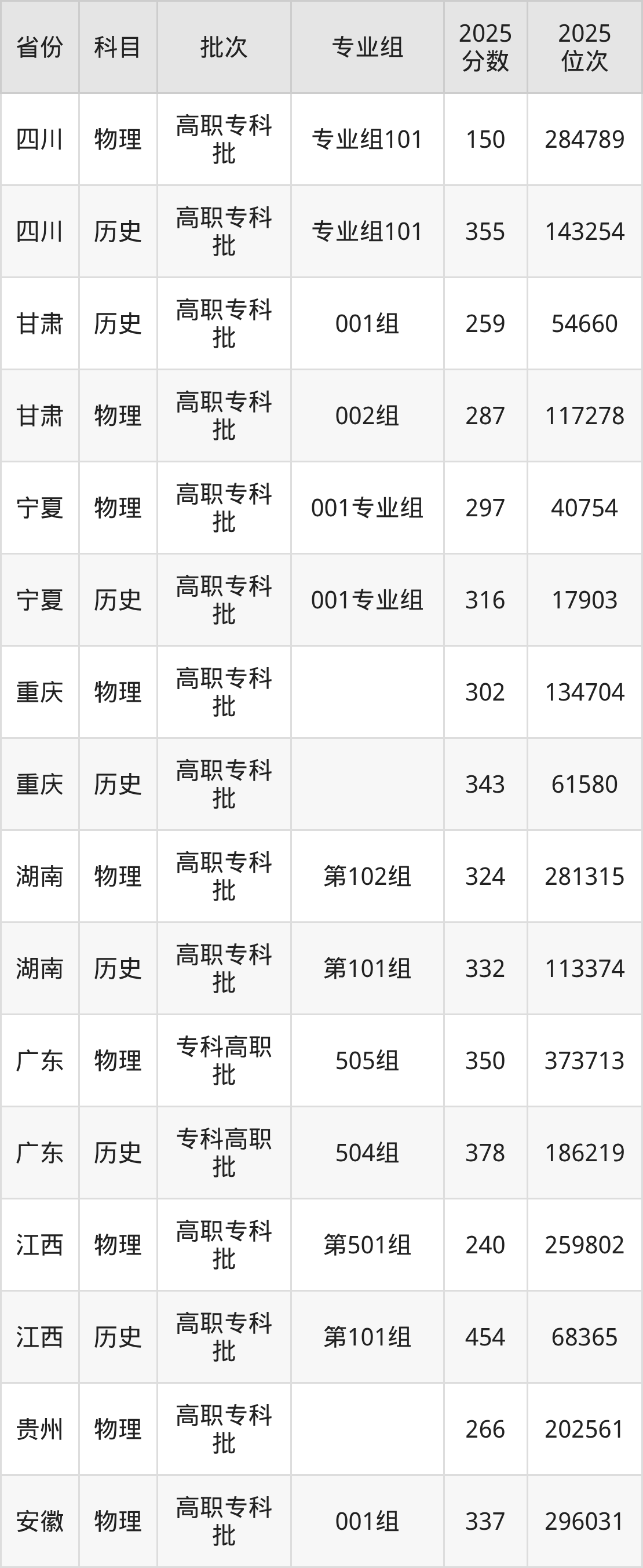 2025年在专科物理类进行招生,各专业组分数线详情如下: