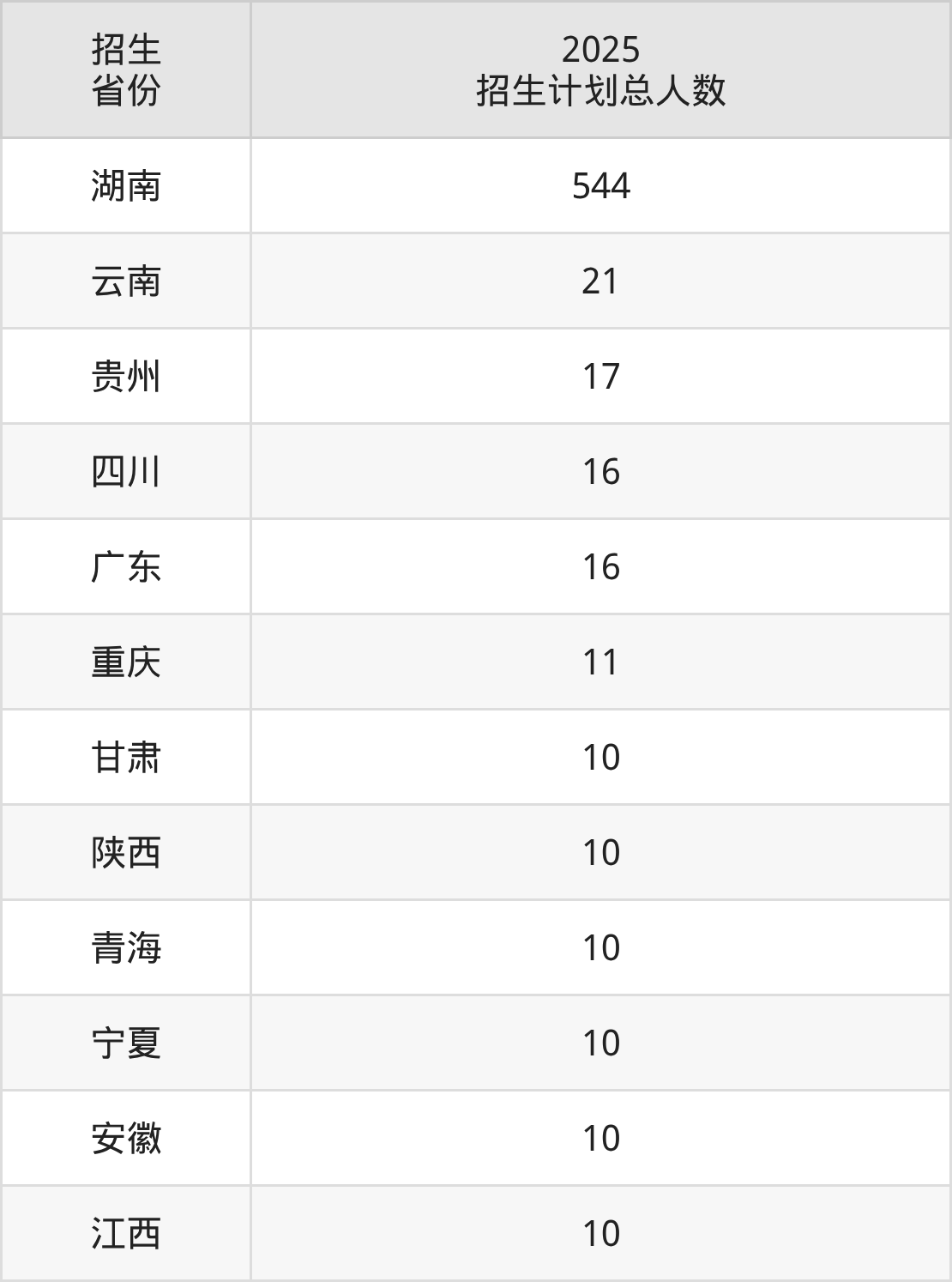 2025年湘南幼儿师范高等专科学校面向全国12个省市开展专科招生;招生专业共8个,招生人数共685人。2025年在湖南省招生计划总人数是544人,其中,湘南幼儿师范高等专科学校在湖南省招生人数最多的是婴幼儿托育服务与管理。湘南幼儿师范高等专科学校在各省具体招生人数情况如下表。