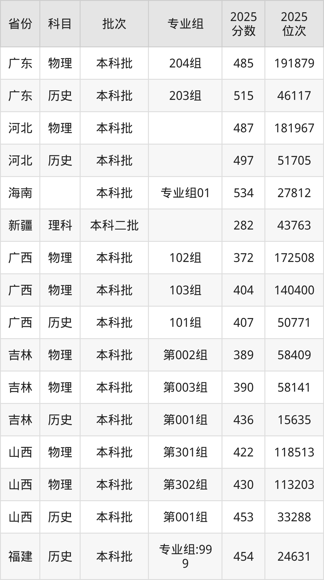 2025年在本科理科进行招生,各专业组分数线详情如下: