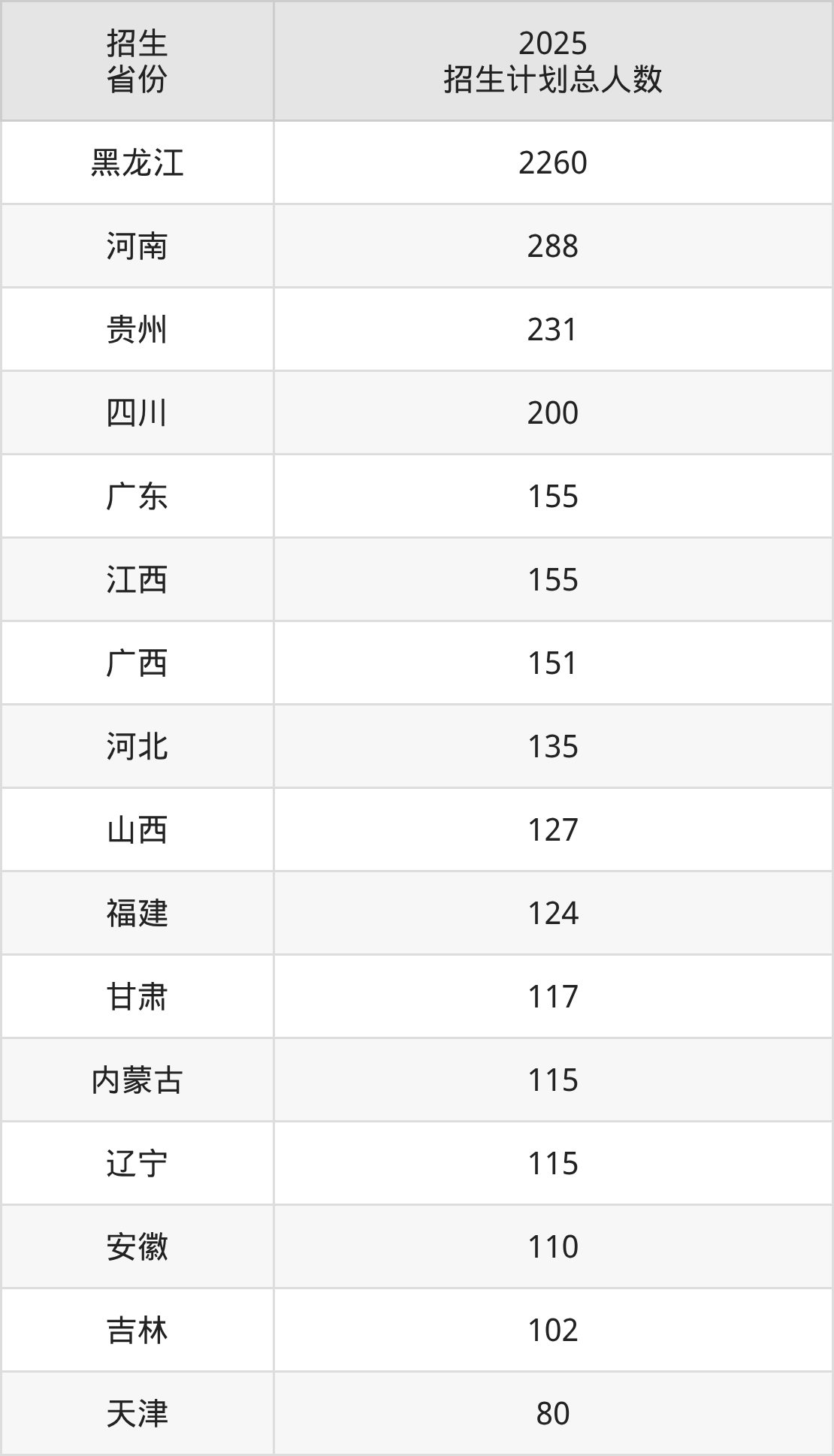 2025年哈尔滨商业大学面向全国28个省市开展本科招生;招生专业共48个,招生人数共4949人。2025年在黑龙江省招生计划总人数是2260人,其中,哈尔滨商业大学在黑龙江省招生人数最多的是计算机科学与技术。哈尔滨商业大学在各省具体招生人数情况如下表。
