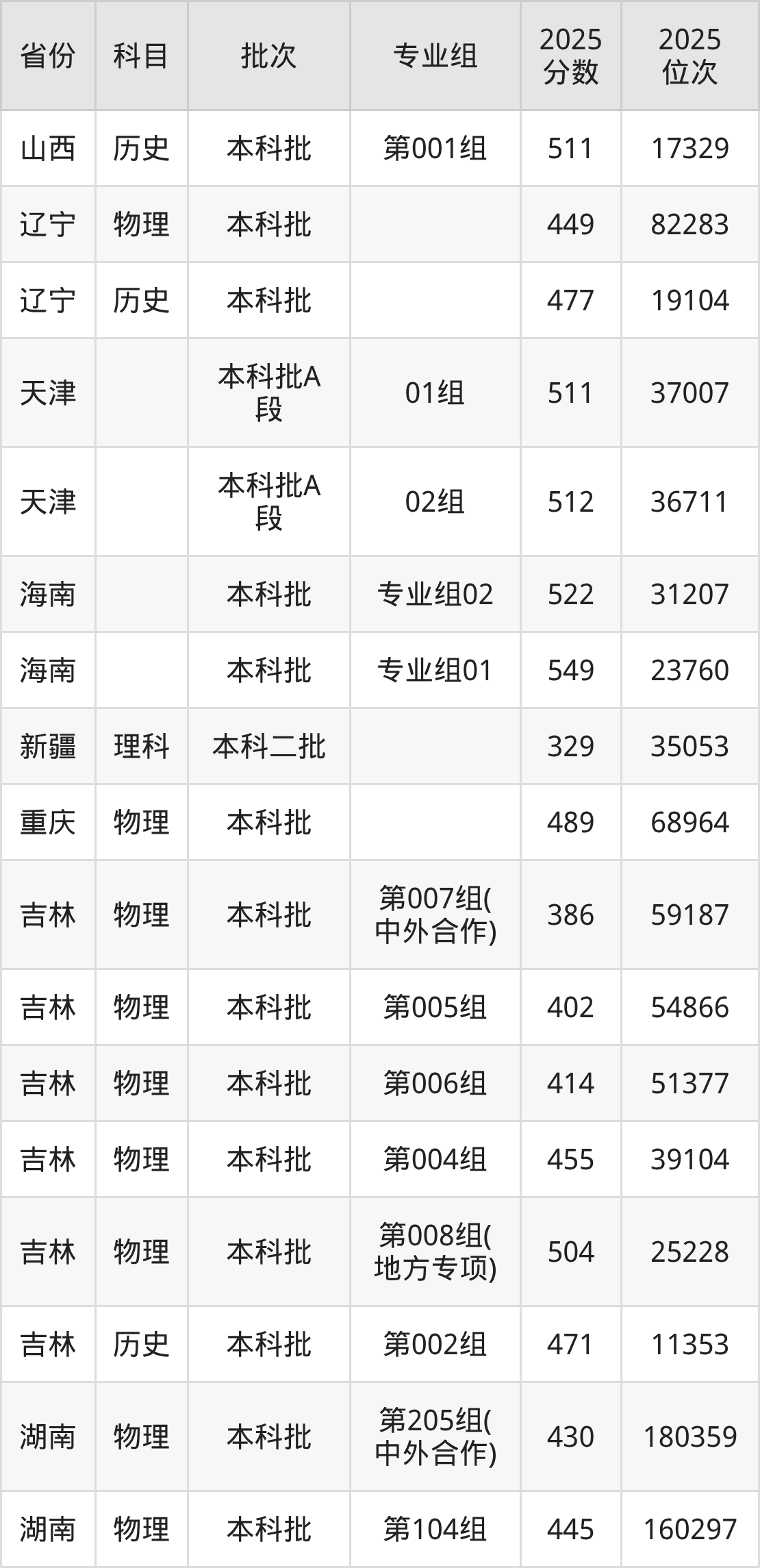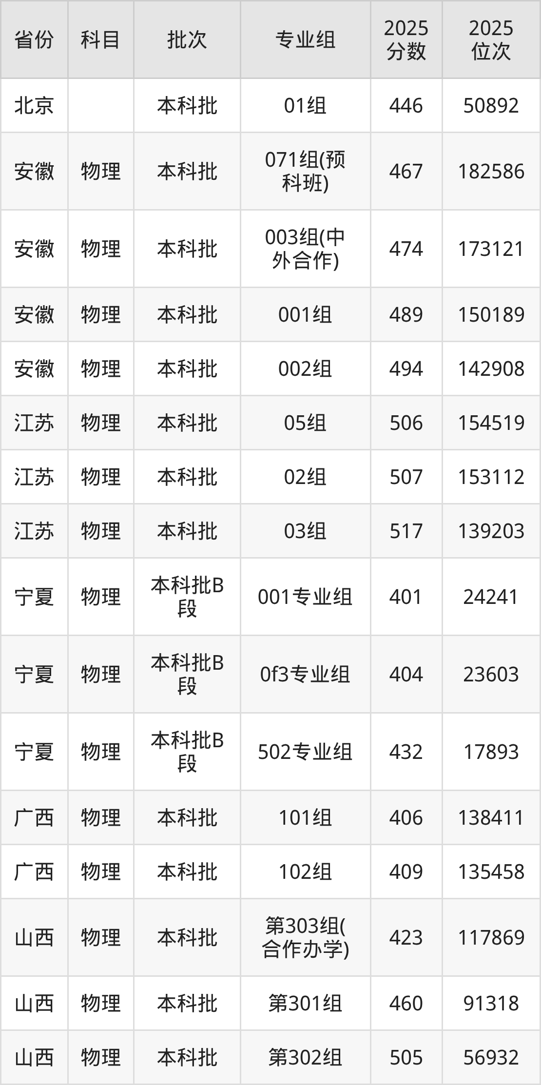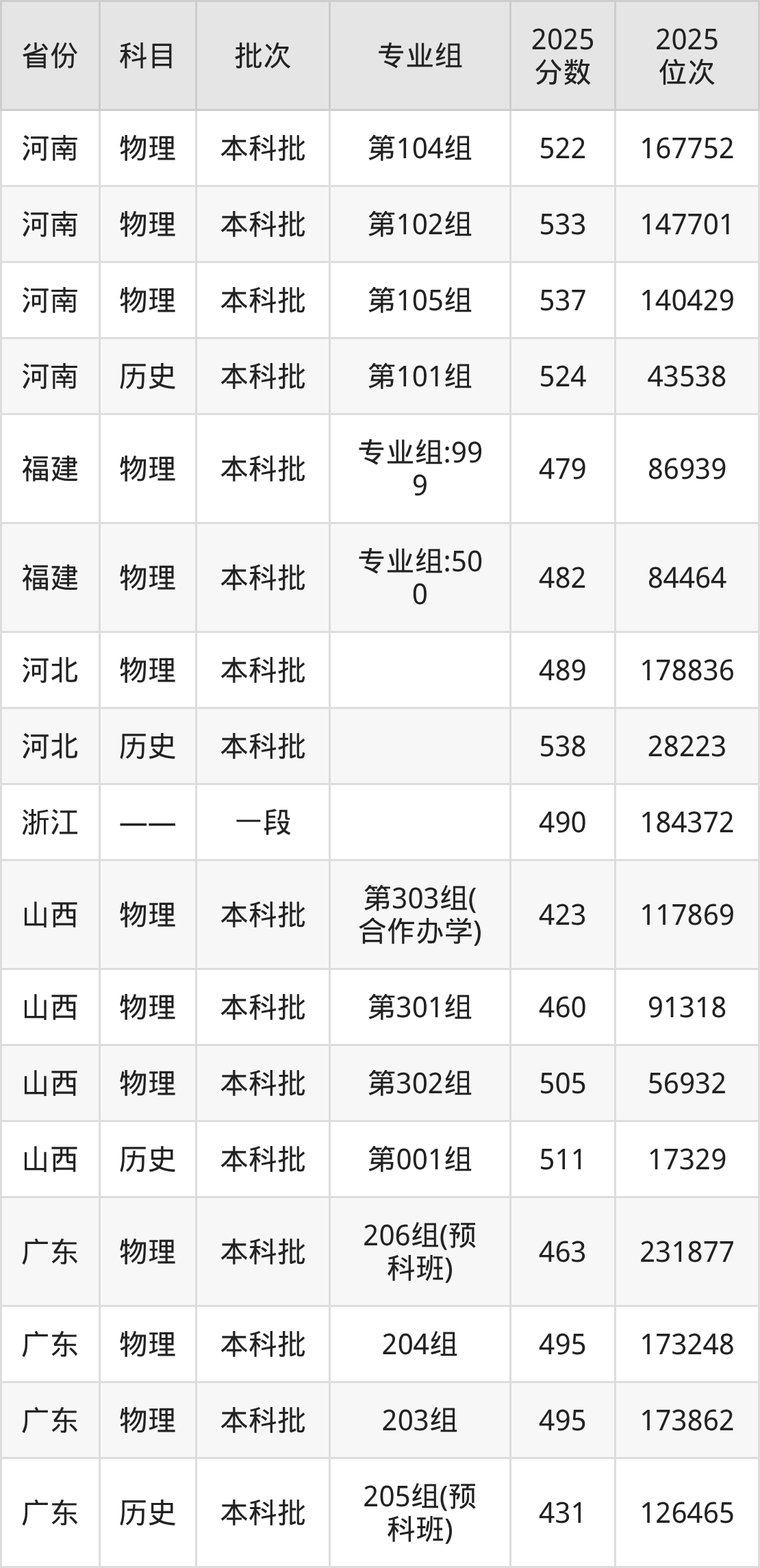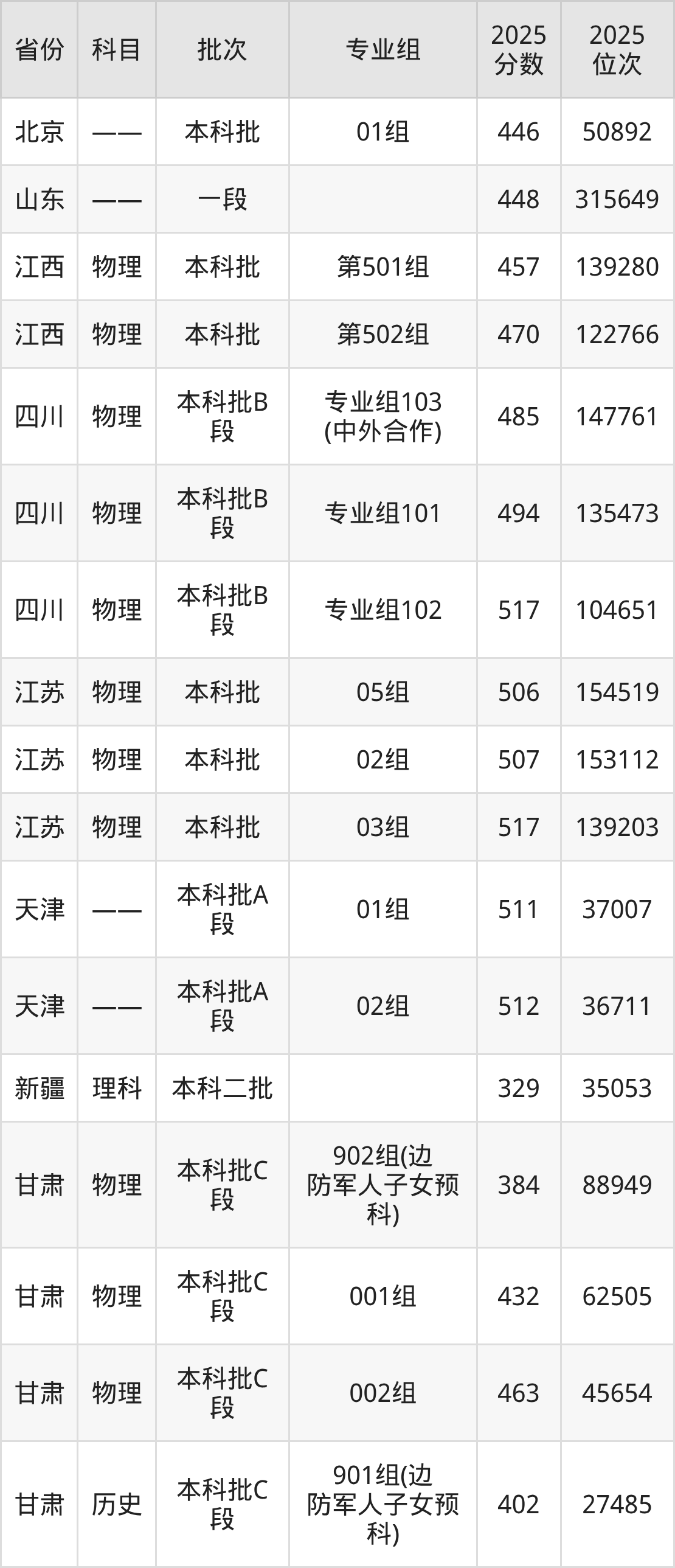 2025年在本科物理类进行招生,各专业组分数线详情如下: