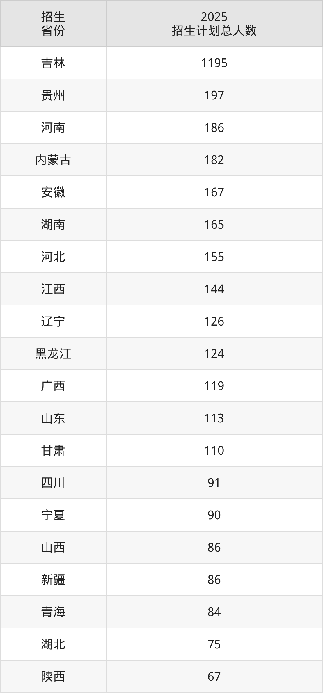 2025年长春工程学院面向全国29个省市开展本科招生;招生专业共43个,招生人数共3948人。2025年在吉林省招生计划总人数是1195人,其中,长春工程学院在吉林省招生人数最多的是机械设计制造及其自动化。长春工程学院在各省具体招生人数情况如下表。