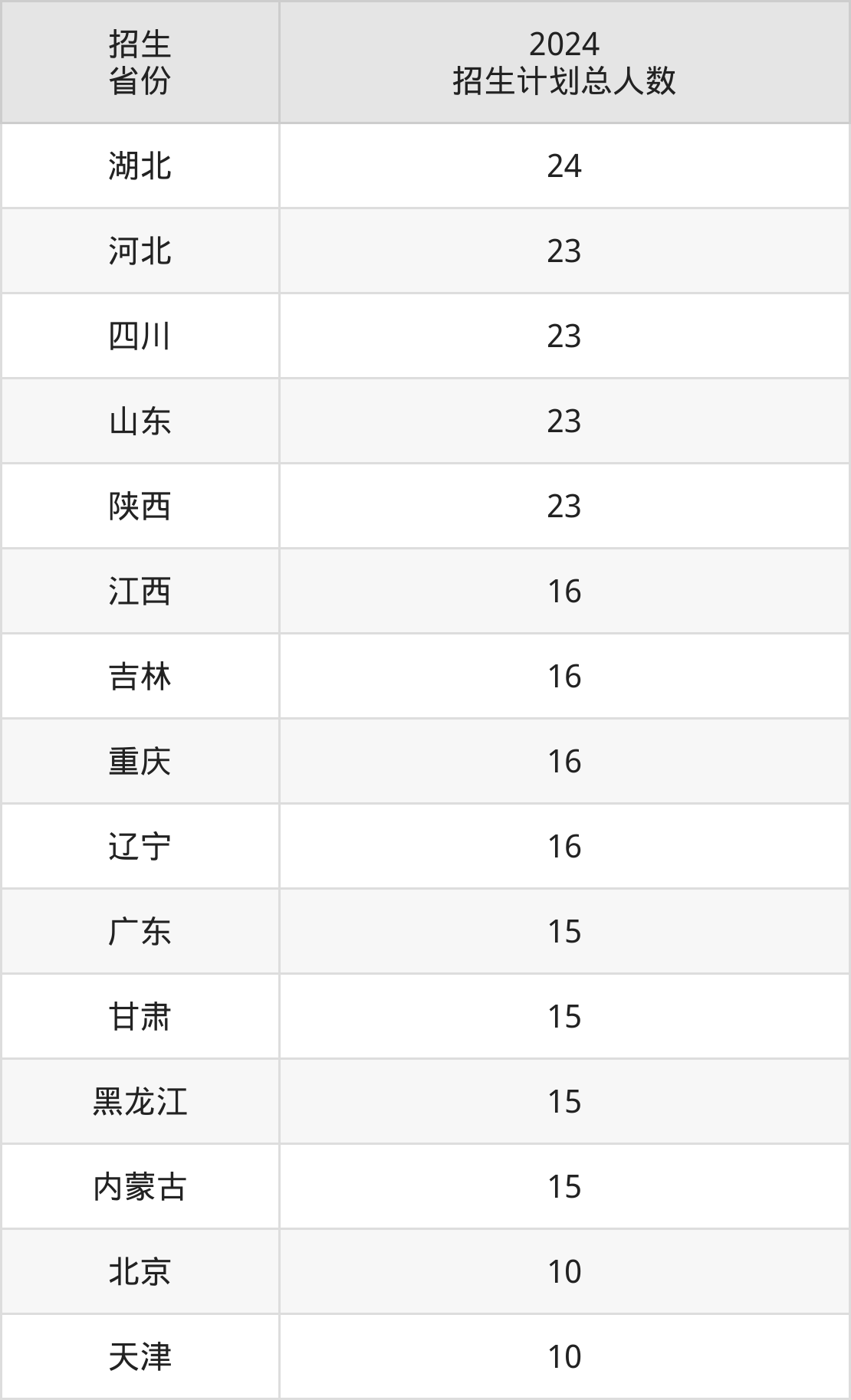 2024年中国人民解放军战略支援部队航天工程大学面向全国15个省市开展本科招生;招生专业共18个,招生人数共260人。2024年在北京市招生计划总人数是10人,其中,中国人民解放军战略支援部队航天工程大学在北京市招生人数最多的是光电信息科学与工程。中国人民解放军战略支援部队航天工程大学在各省具体招生人数情况如下表。