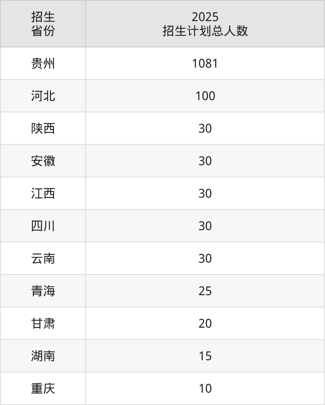 2025年贵州盛华职业学院面向全国11个省市开展专科招生;招生专业共17个,招生人数共1401人。2025年在贵州省招生计划总人数是1081人,其中,贵州盛华职业学院在贵州省招生人数最多的是康复治疗技术。贵州盛华职业学院在各省具体招生人数情况如下表。