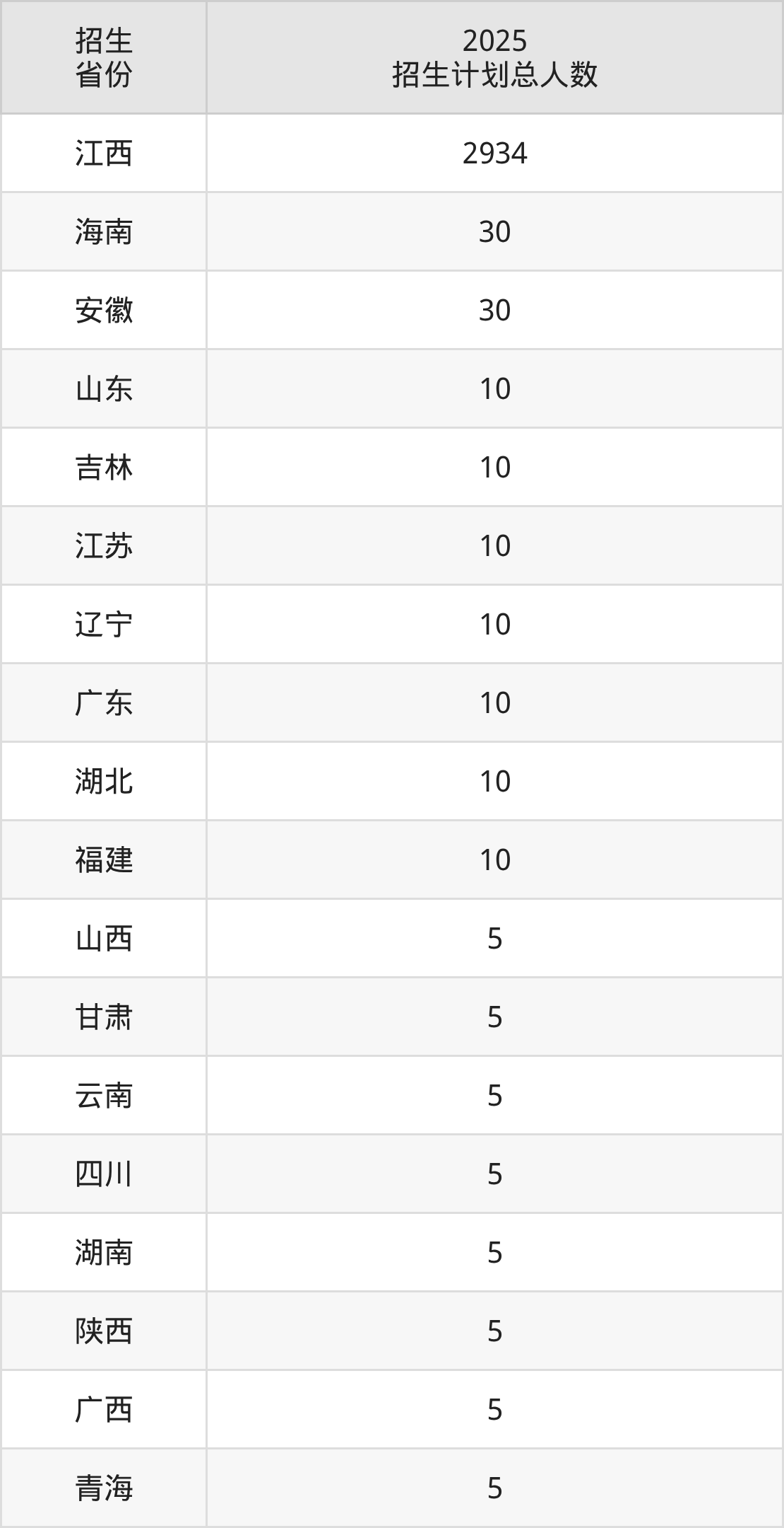 2025年江西制造职业技术学院面向全国18个省市开展专科招生;招生专业共37个,招生人数共3104人。2025年在江西省招生计划总人数是2934人,其中,江西制造职业技术学院在江西省招生人数最多的是数字媒体技术。江西制造职业技术学院在各省具体招生人数情况如下表。