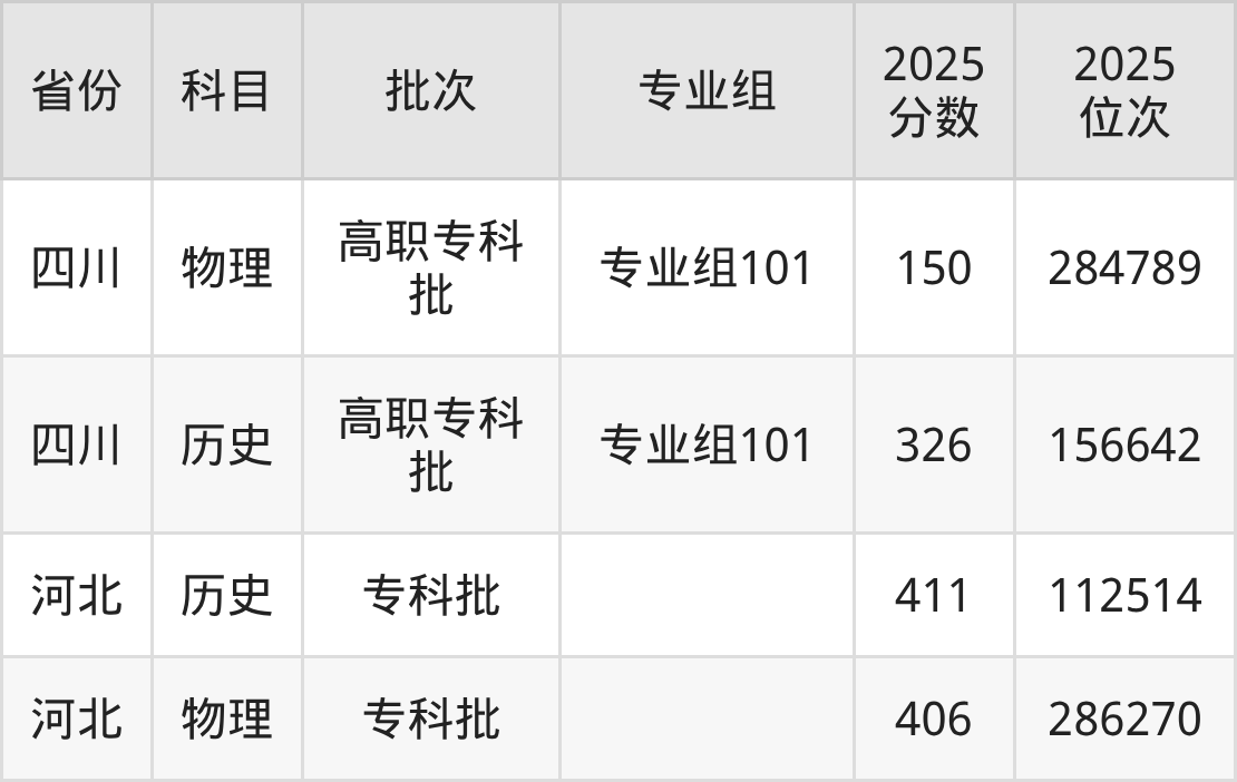 2025年汝州职业技术学院全国录取分数线是150分到432分,录取最低在四川物理类(专业组101)、录取最高在河北历史类。各省各专业组最低分具有差异,详情如下:
