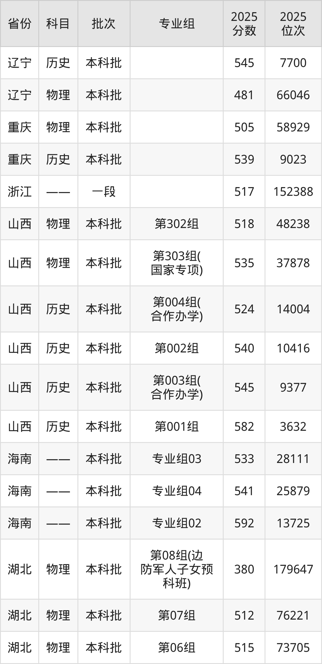 2025年烟台大学全国录取分数线是380分到596分,录取最低在湖北物理类(第08组(边防军人子女预科班))、录取最高在山东。各省各专业组最低分具有差异,详情如下: