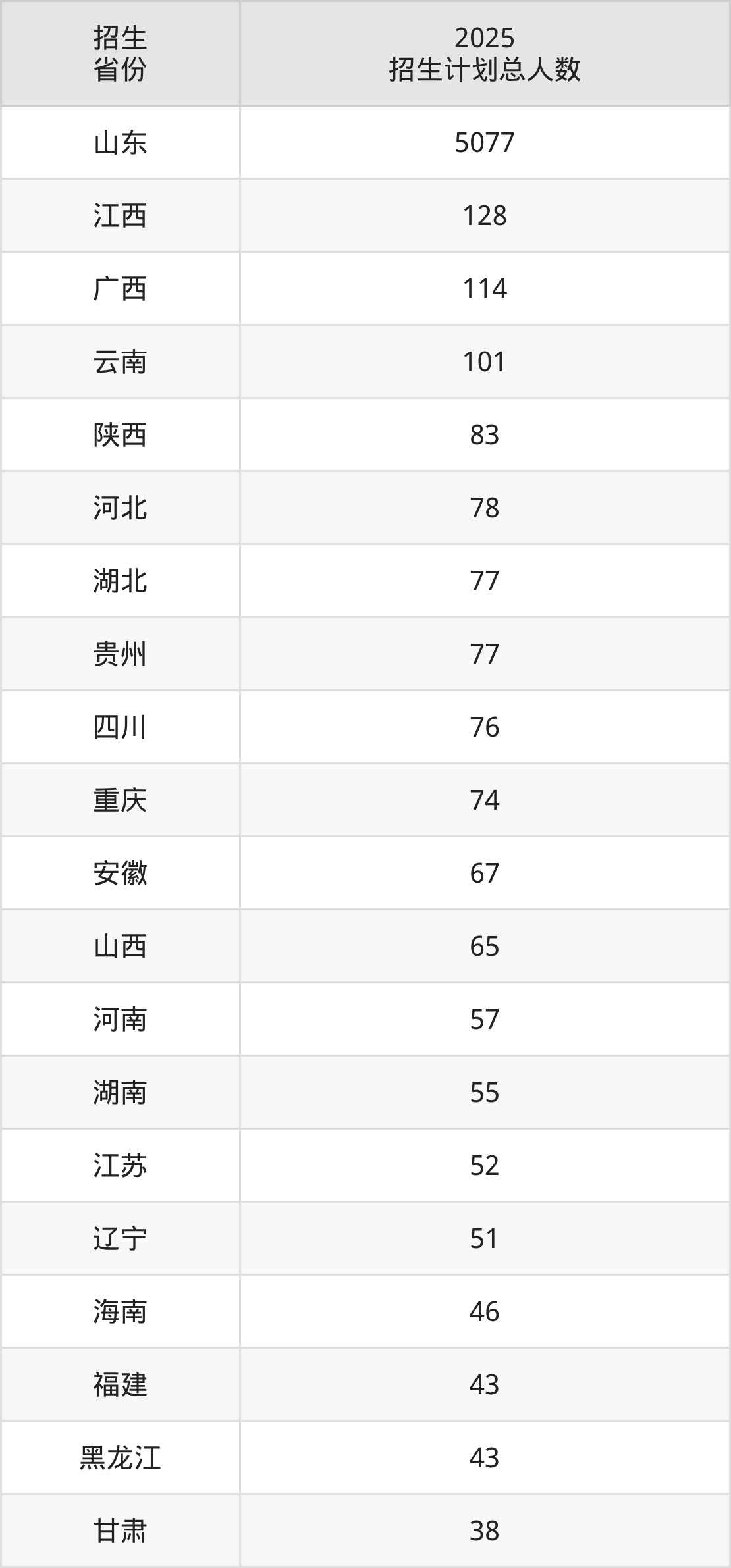 2025年烟台大学面向全国29个省市开展本科招生;招生专业共56个,招生人数共6629人。2025年在山东省招生计划总人数是5077人,其中,烟台大学在山东省招生人数最多的是汉语言文学。烟台大学在各省具体招生人数情况如下表。