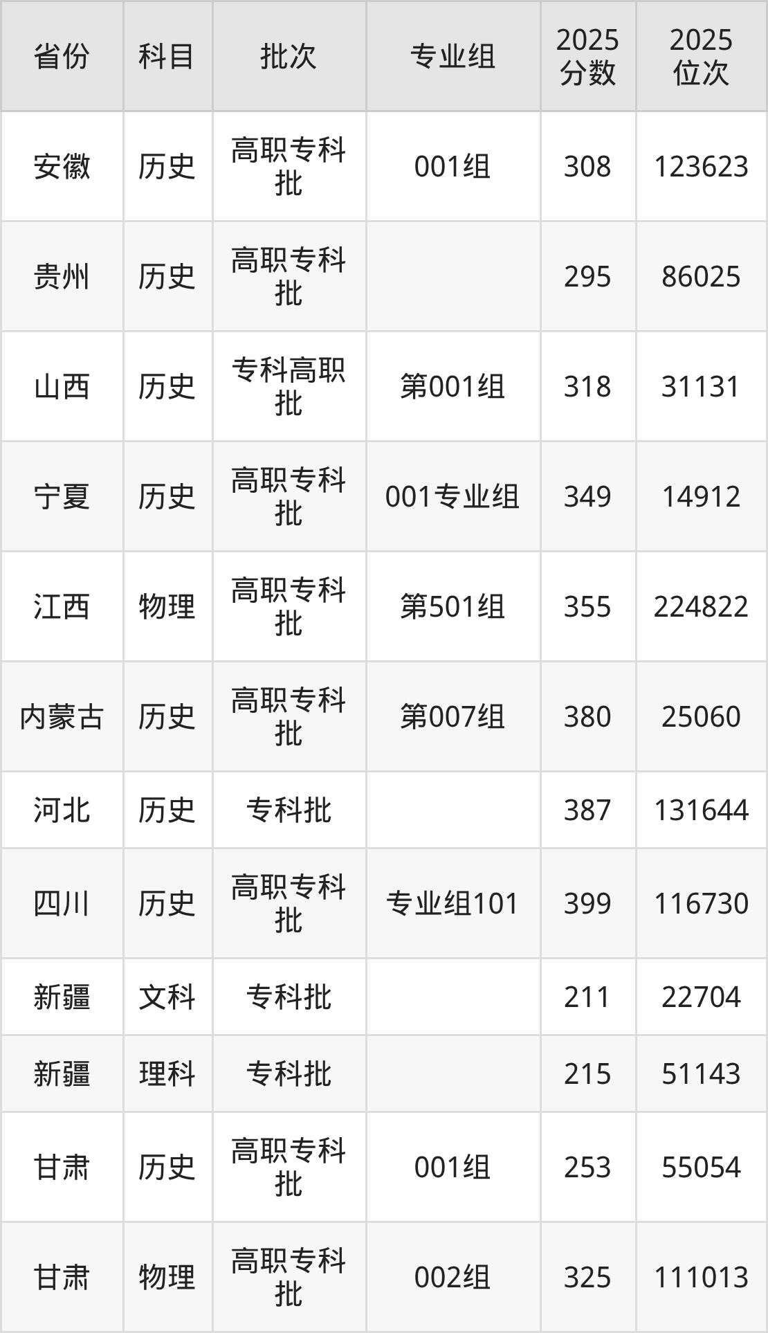 2025年在专科历史类进行招生,各专业组分数线详情如下: