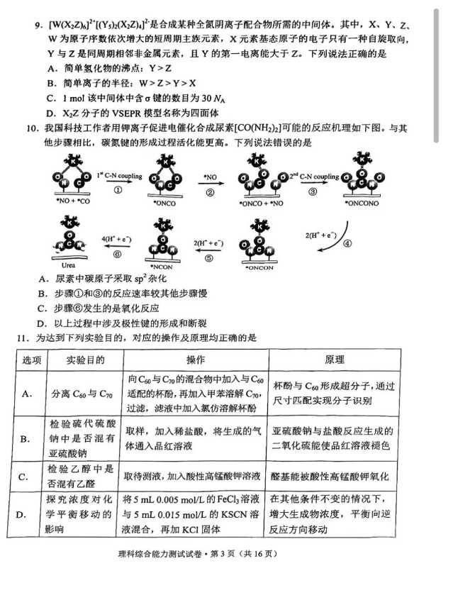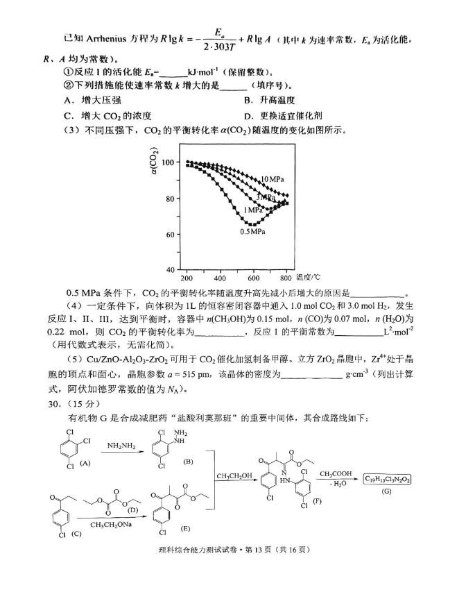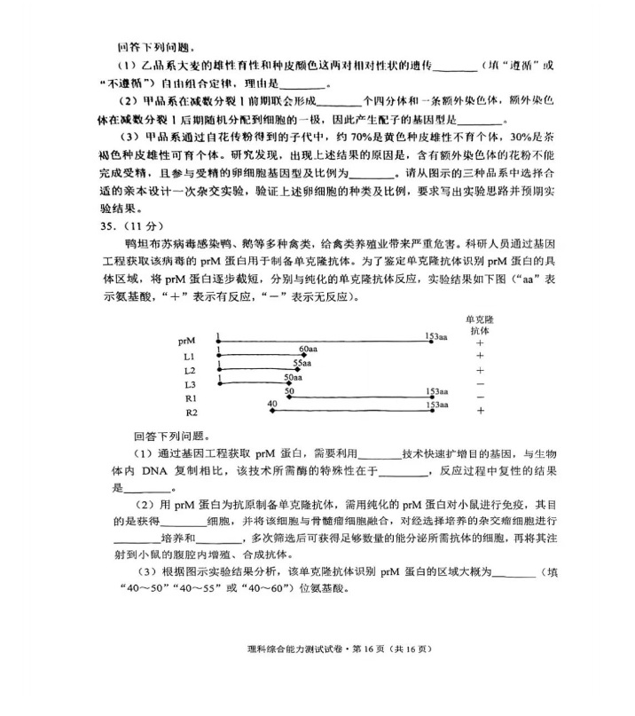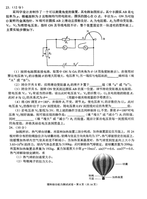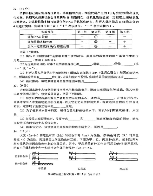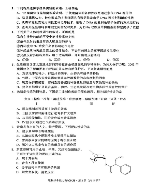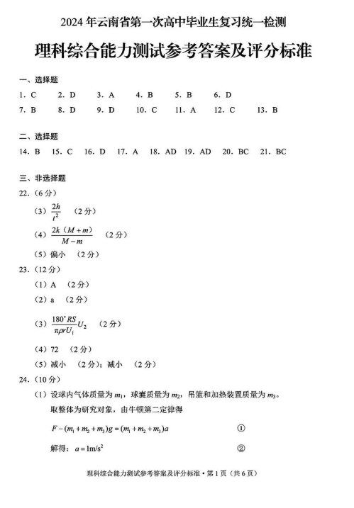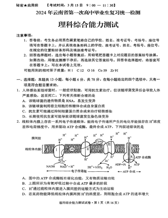 5.2024云南高三第一次统测理综试卷及答案解析