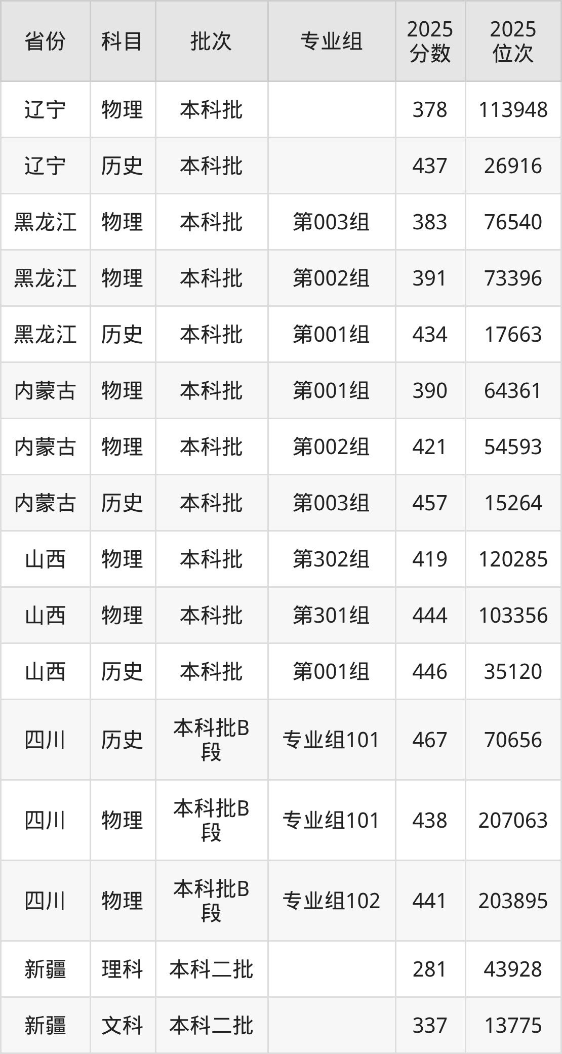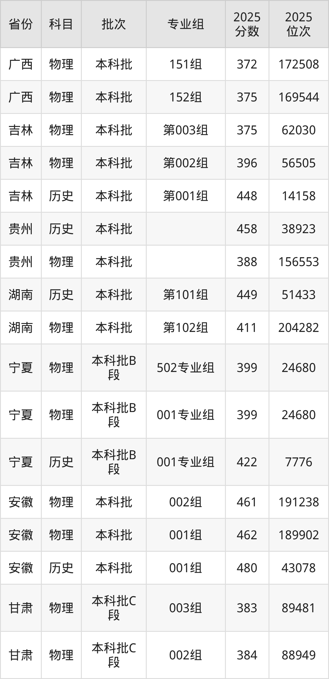 普通类本科物理类最低383分,本科历史类最低434分