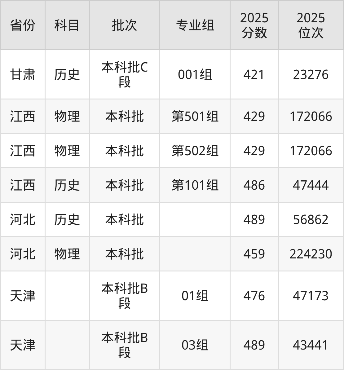 普通类本科物理类最低419分,本科历史类最低446分