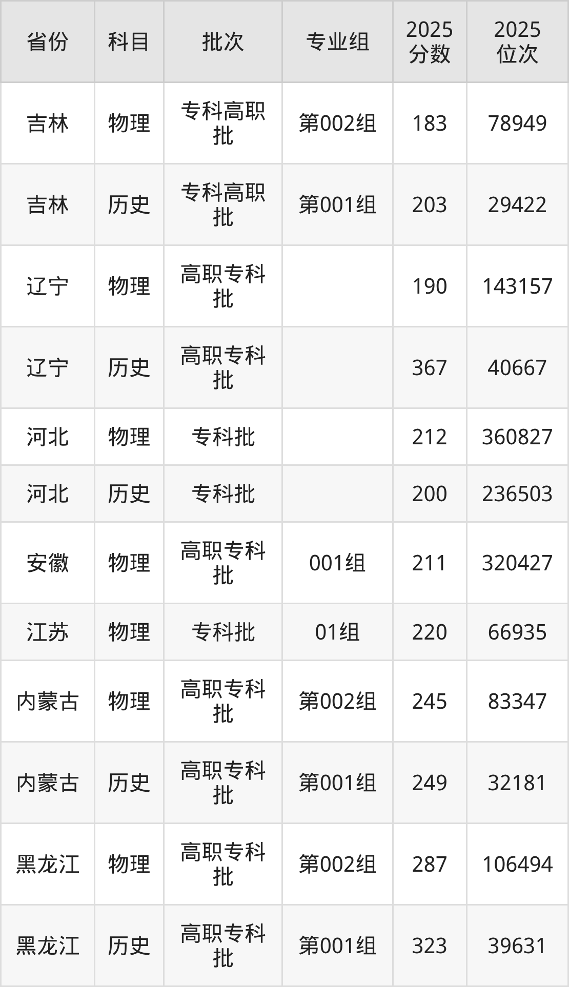 普通类专科物理类最低183分,专科历史类最低203分