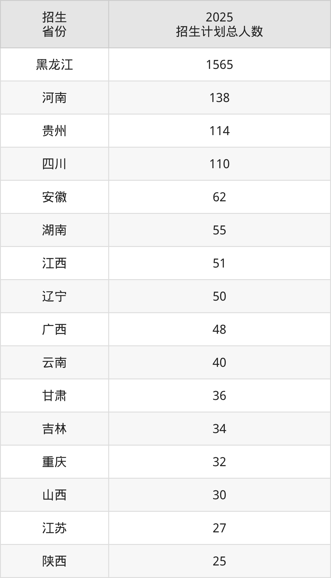 2025年哈尔滨学院面向全国25个省市开展本科招生;招生专业共33个,招生人数共2544人。2025年在黑龙江省招生计划总人数是1565人,其中,哈尔滨学院在黑龙江省招生人数最多的是软件工程。哈尔滨学院在各省具体招生人数情况如下表。
