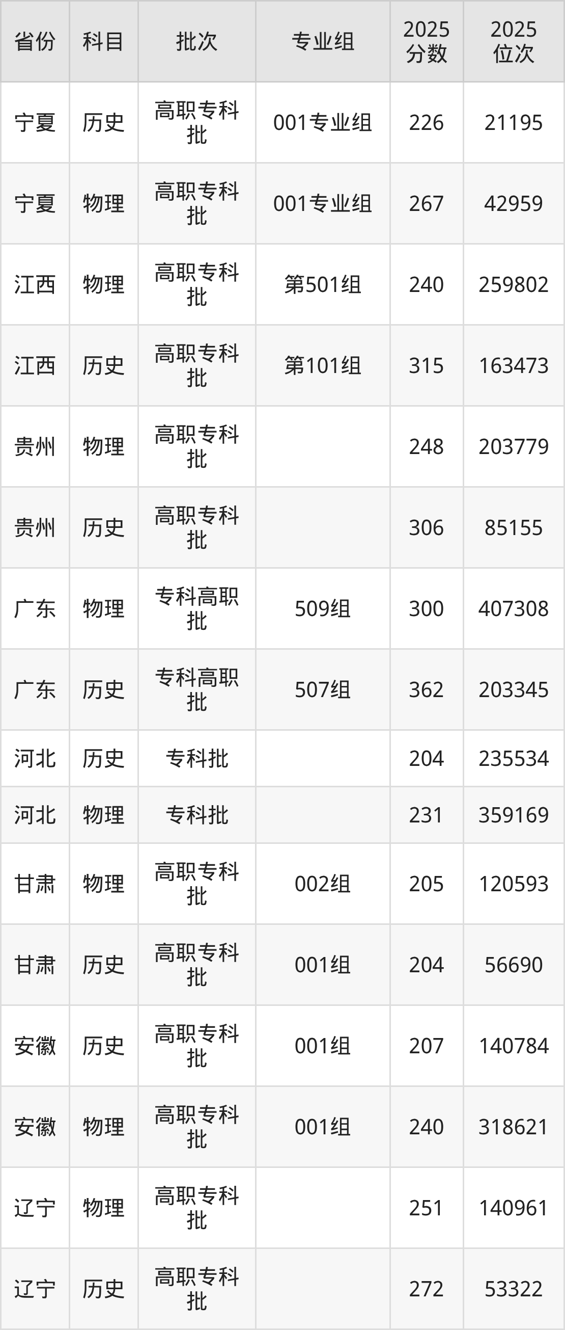 普通类专科物理类最低251分,专科历史类最低272分