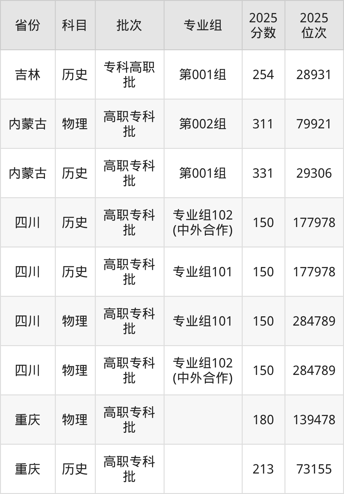 四川城市职业学院专业组101:2025年投档录取最低分为150分,录取最低位次为177978名。