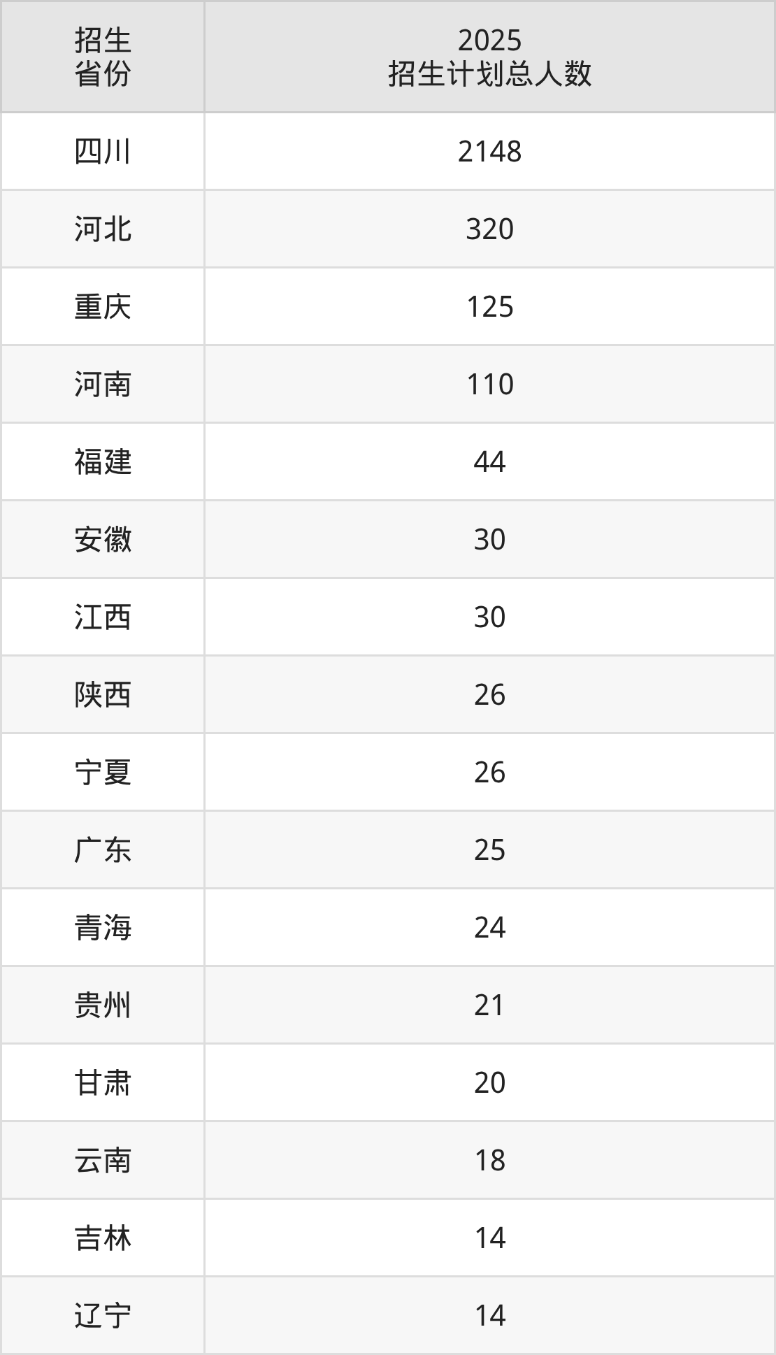 2025年四川城市职业学院面向全国17个省市开展专科招生;招生专业共62个,招生人数共3005人。2025年在四川省招生计划总人数是2148人,其中,四川城市职业学院在四川省招生人数最多的是护理。四川城市职业学院在各省具体招生人数情况如下表。