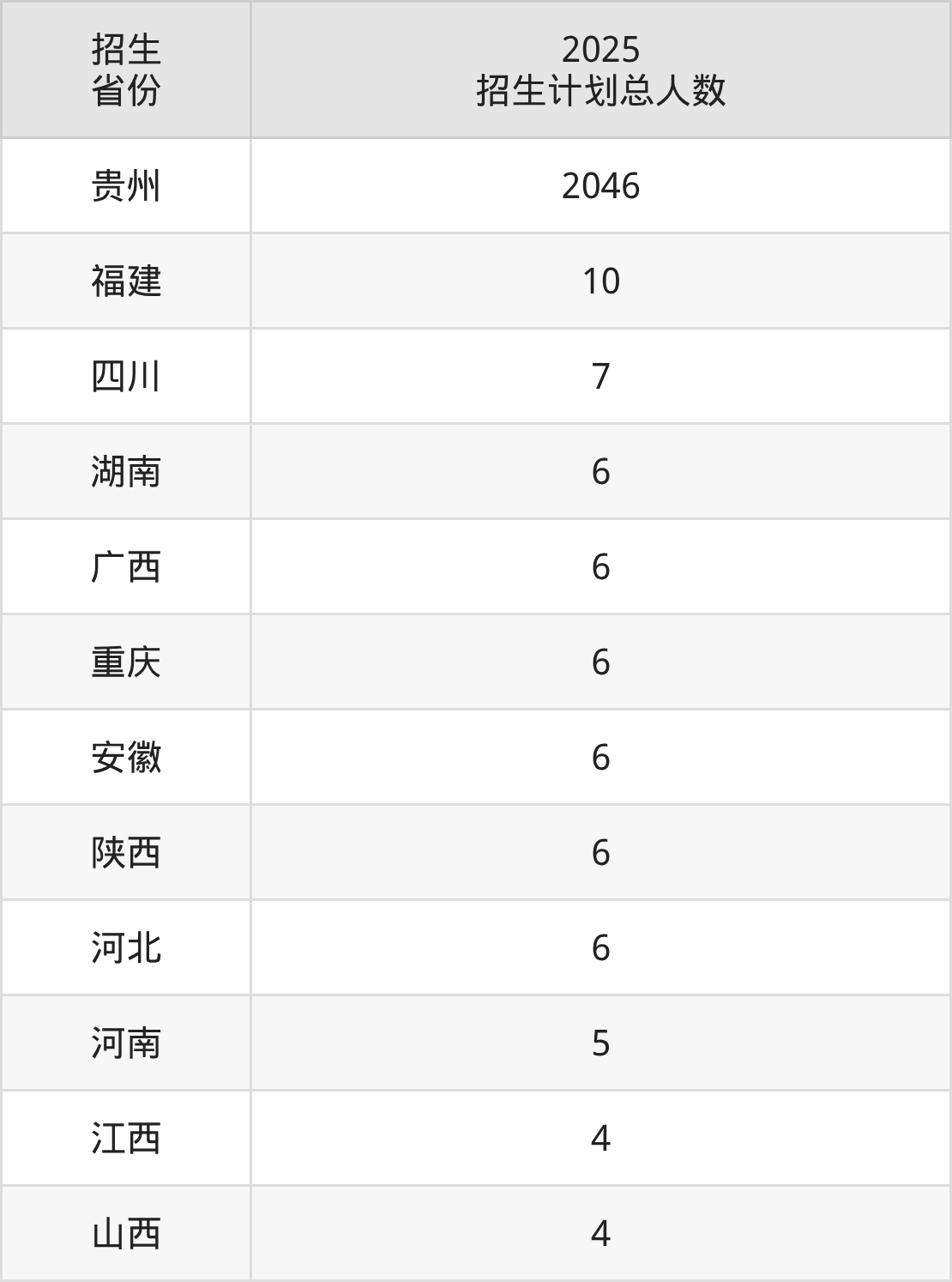 2025年贵州黔南科技学院面向全国12个省市开展本科招生;招生专业共17个,招生人数共2112人。2025年在贵州省招生计划总人数是2046人,其中,贵州黔南科技学院在贵州省招生人数最多的是汉语言文学。贵州黔南科技学院在各省具体招生人数情况如下表。