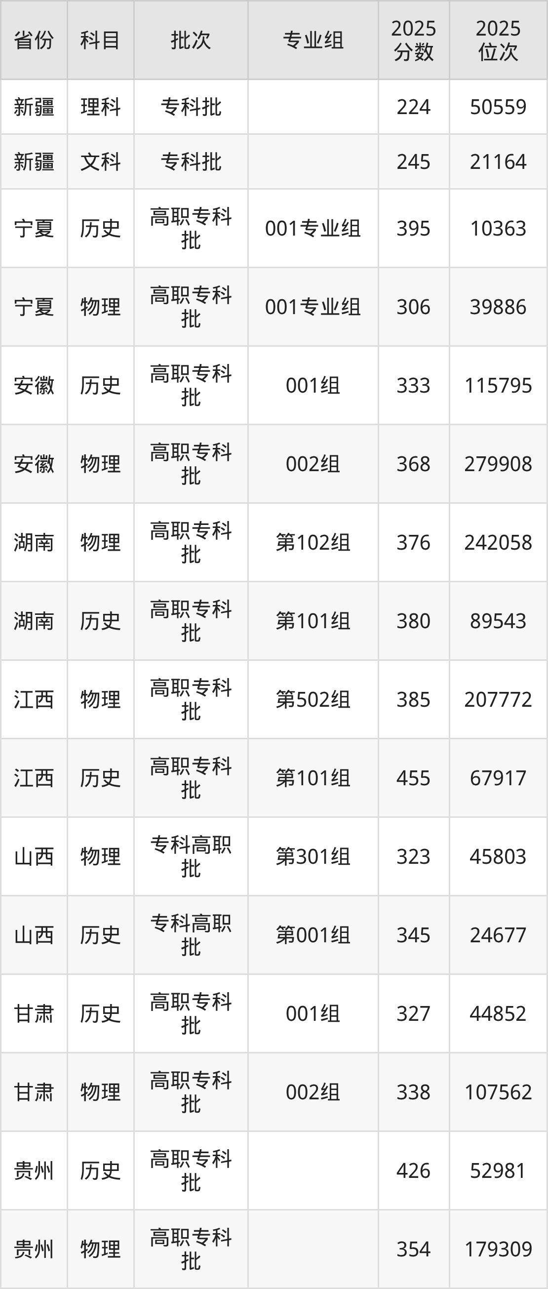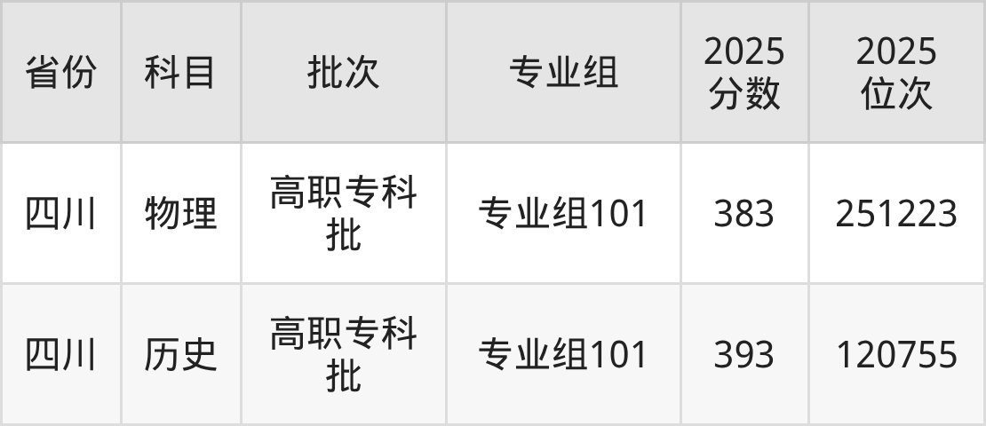 普通类专科物理类最低383分,专科历史类最低393分