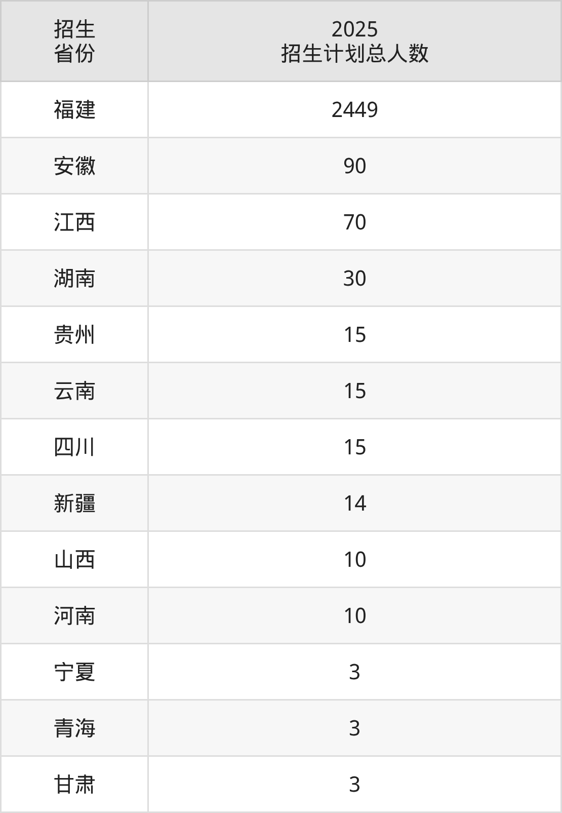 2025年福建林业职业技术学院面向全国13个省市开展专科招生;招生专业共42个,招生人数共2727人。2025年在福建省招生计划总人数是2449人,其中,福建林业职业技术学院在福建省招生人数最多的是大数据与会计。福建林业职业技术学院在各省具体招生人数情况如下表。
