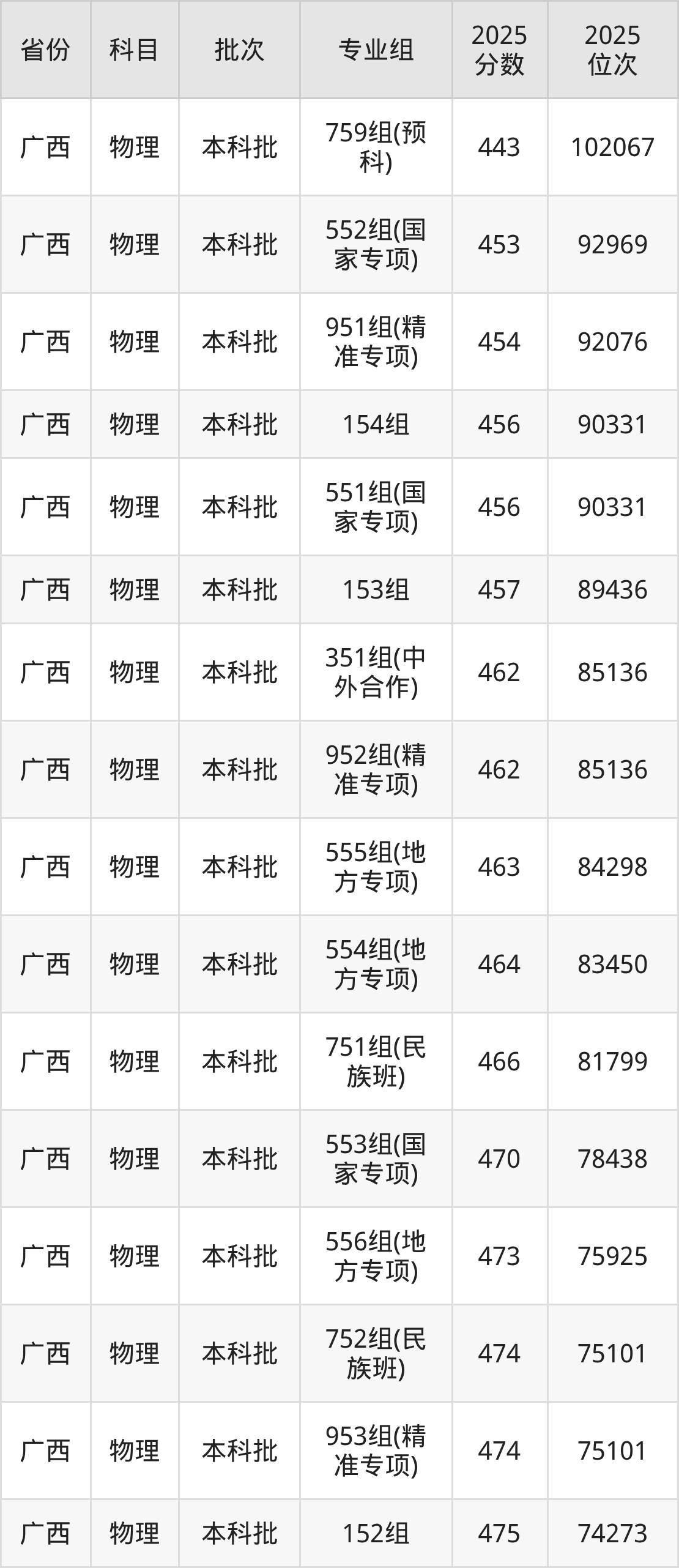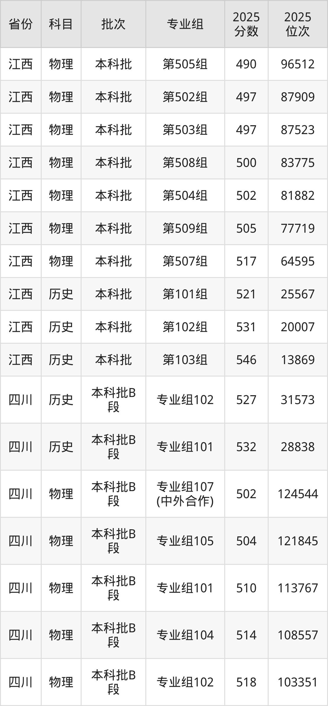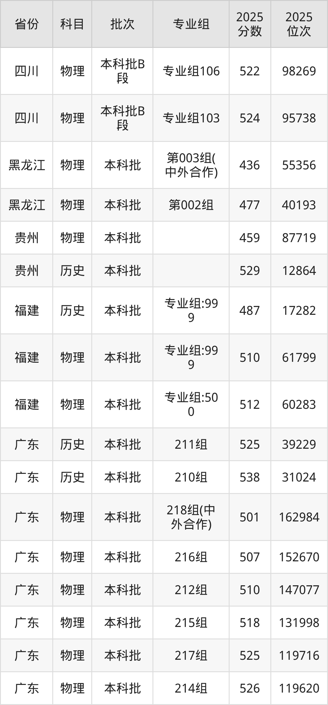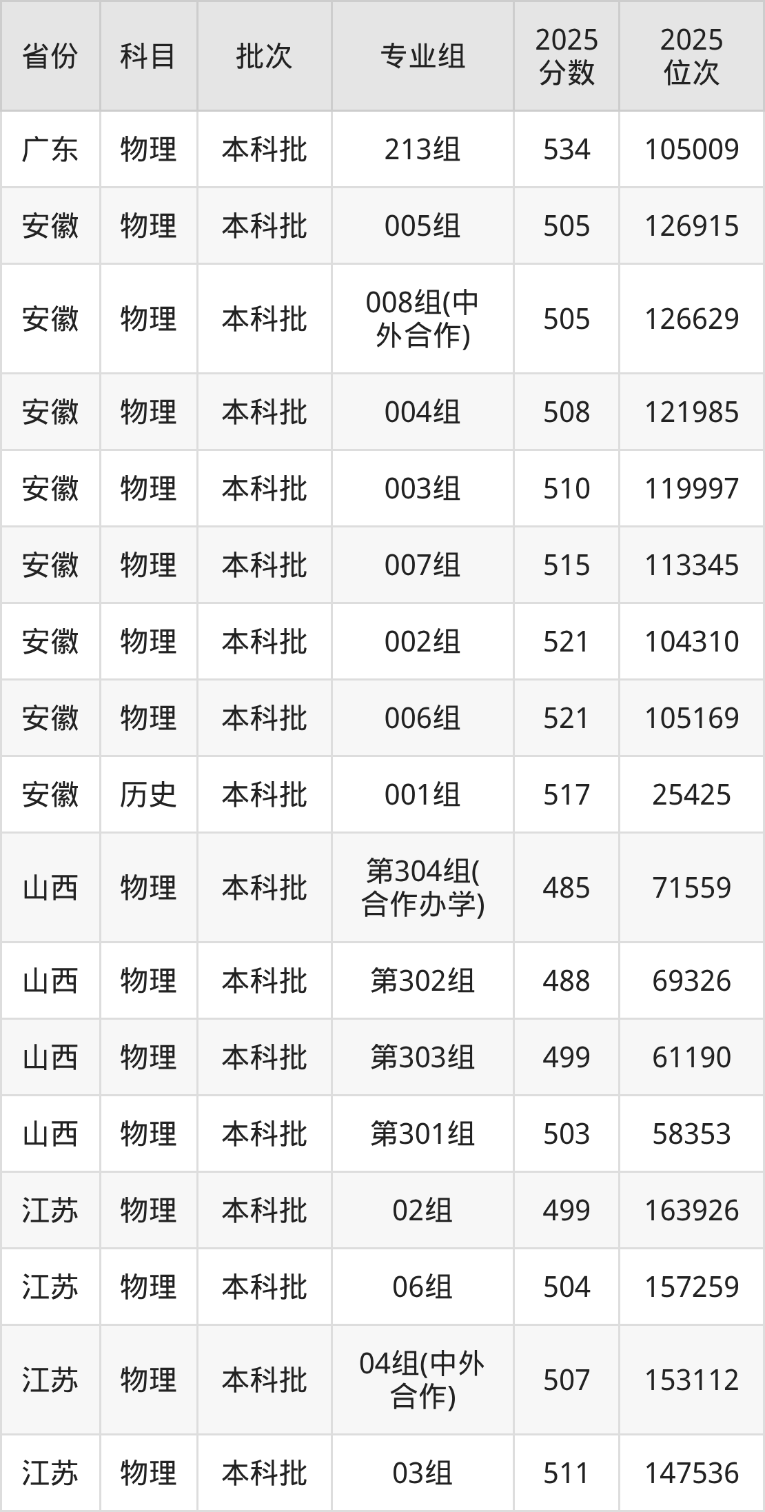 2025年在本科物理类进行招生,各专业组分数线详情如下: