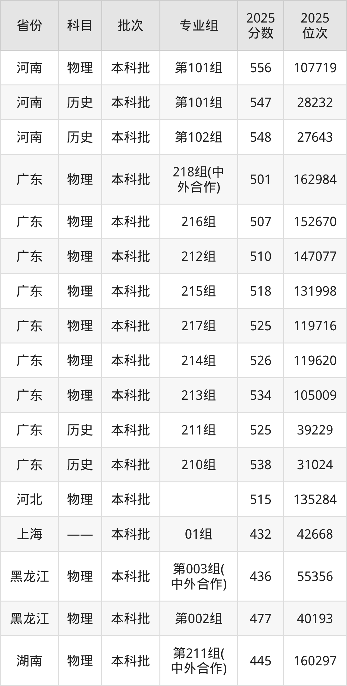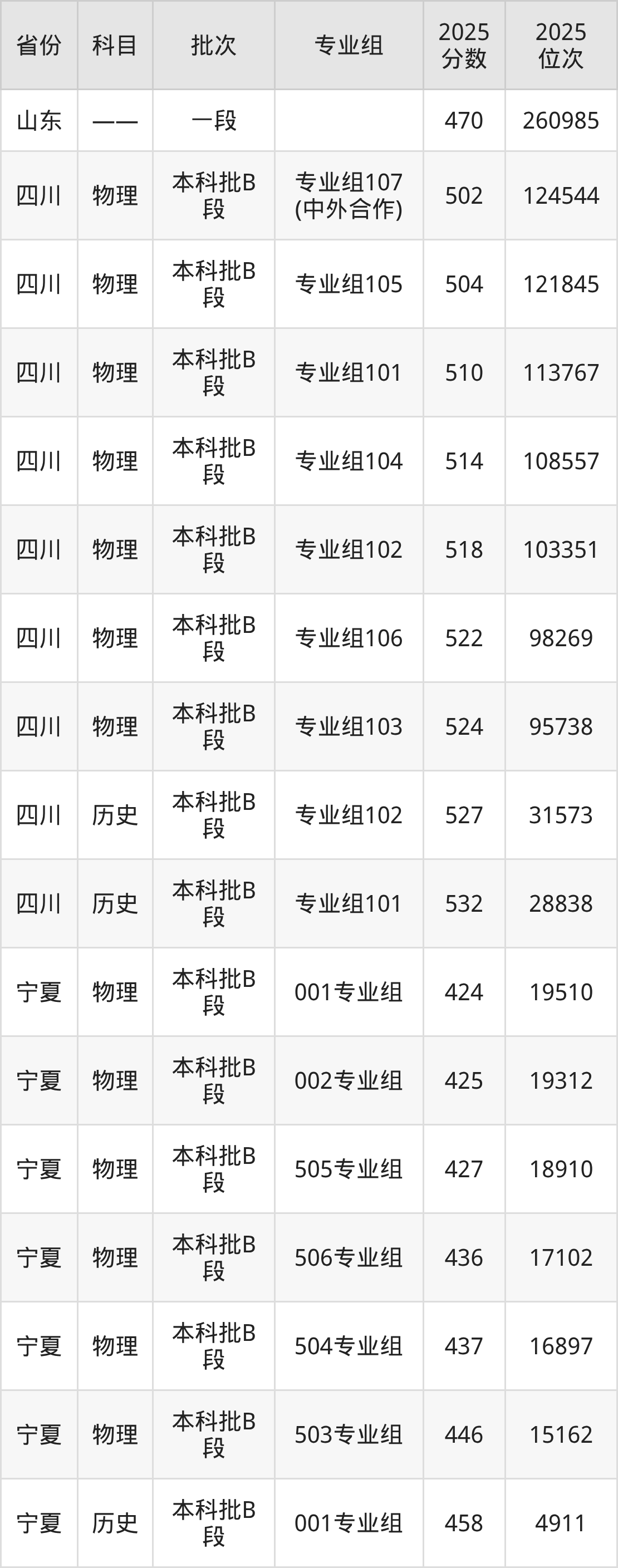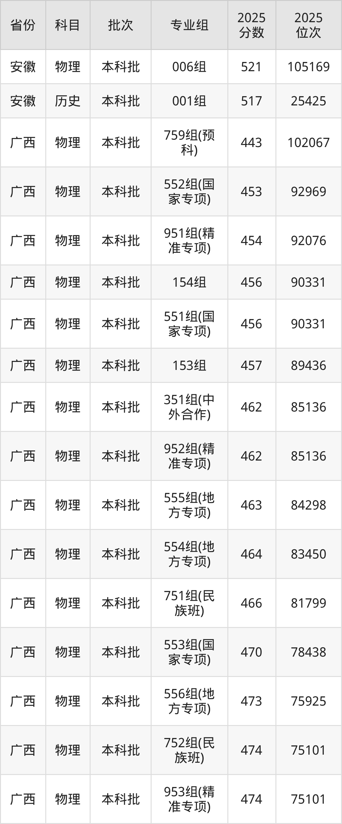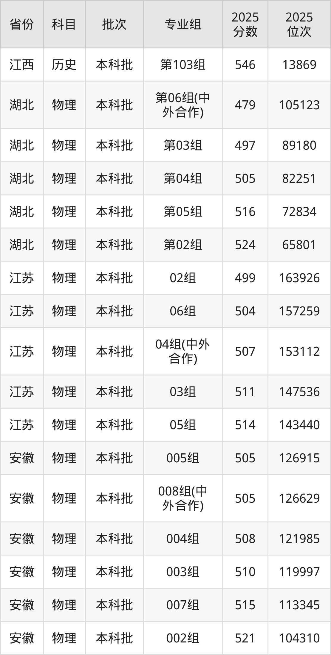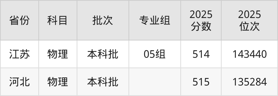 2025年在本科物理类进行招生,各专业组分数线详情如下: