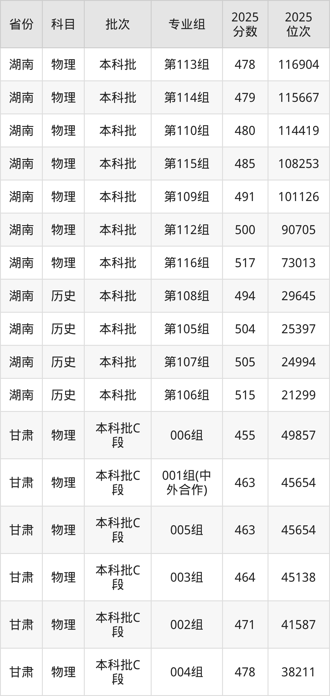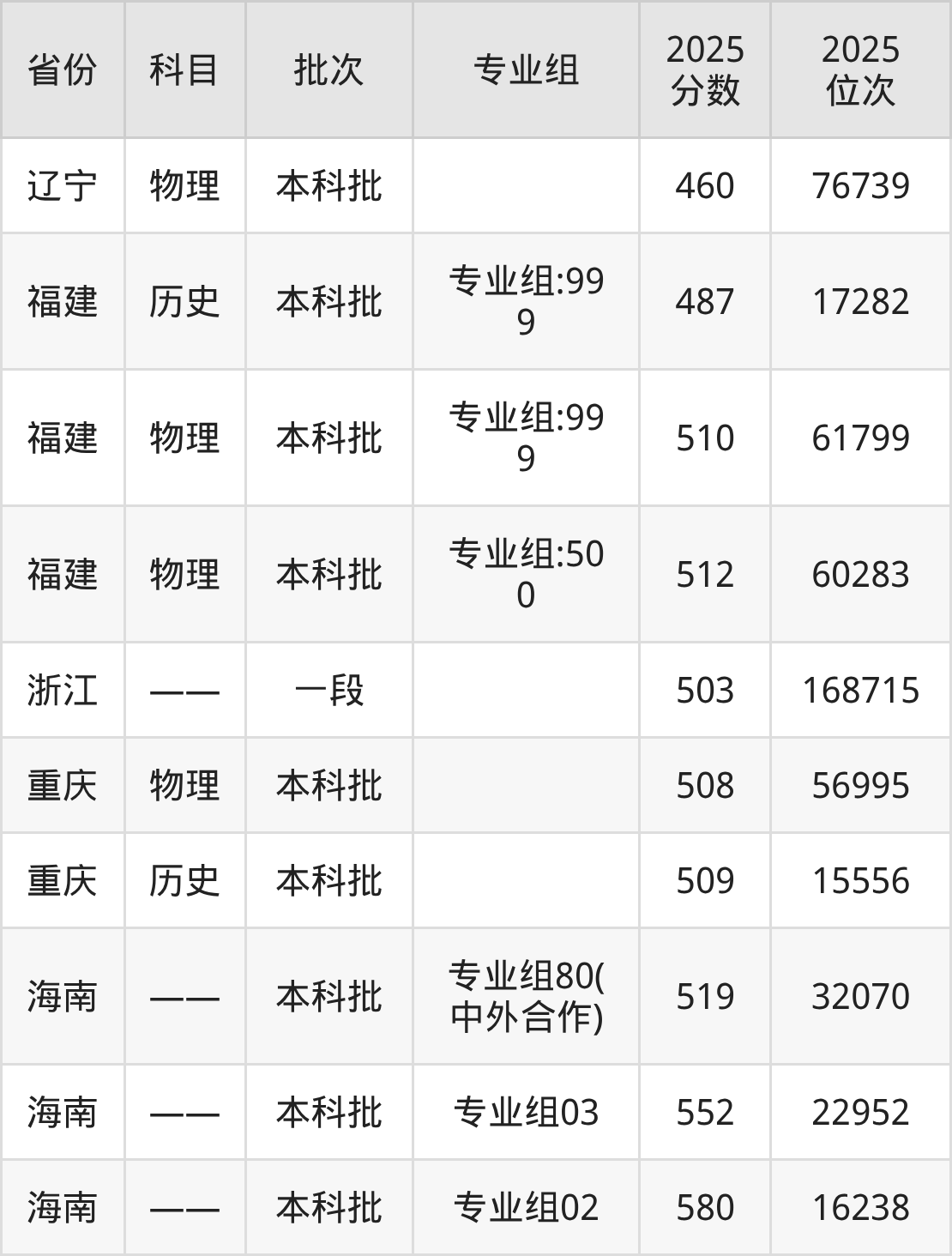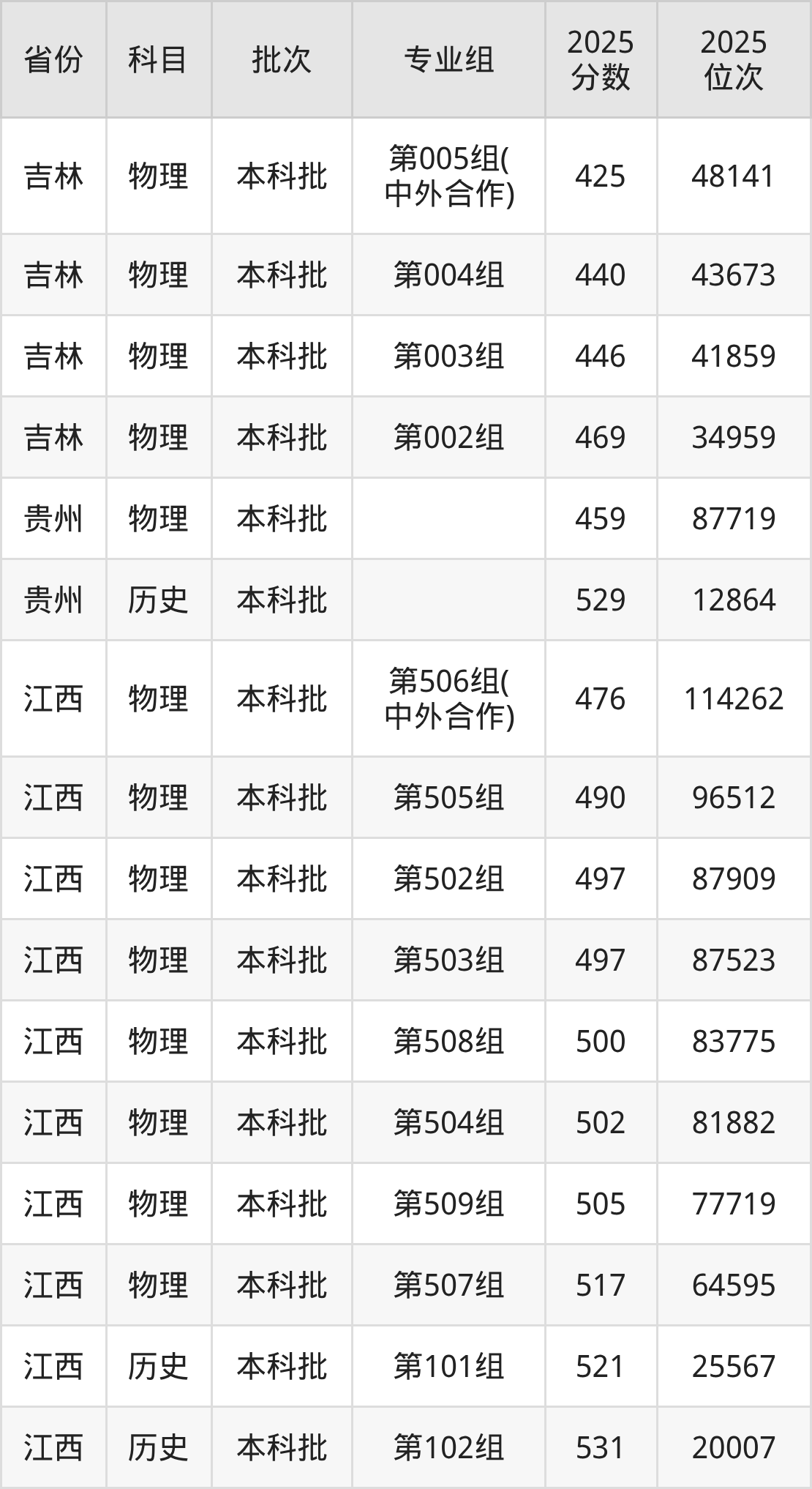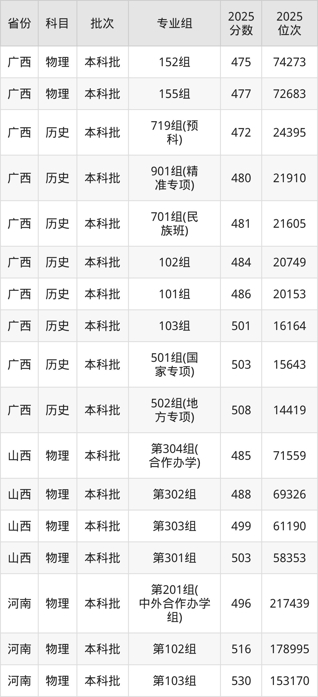 2025年在本科物理类进行招生,各专业组分数线详情如下: