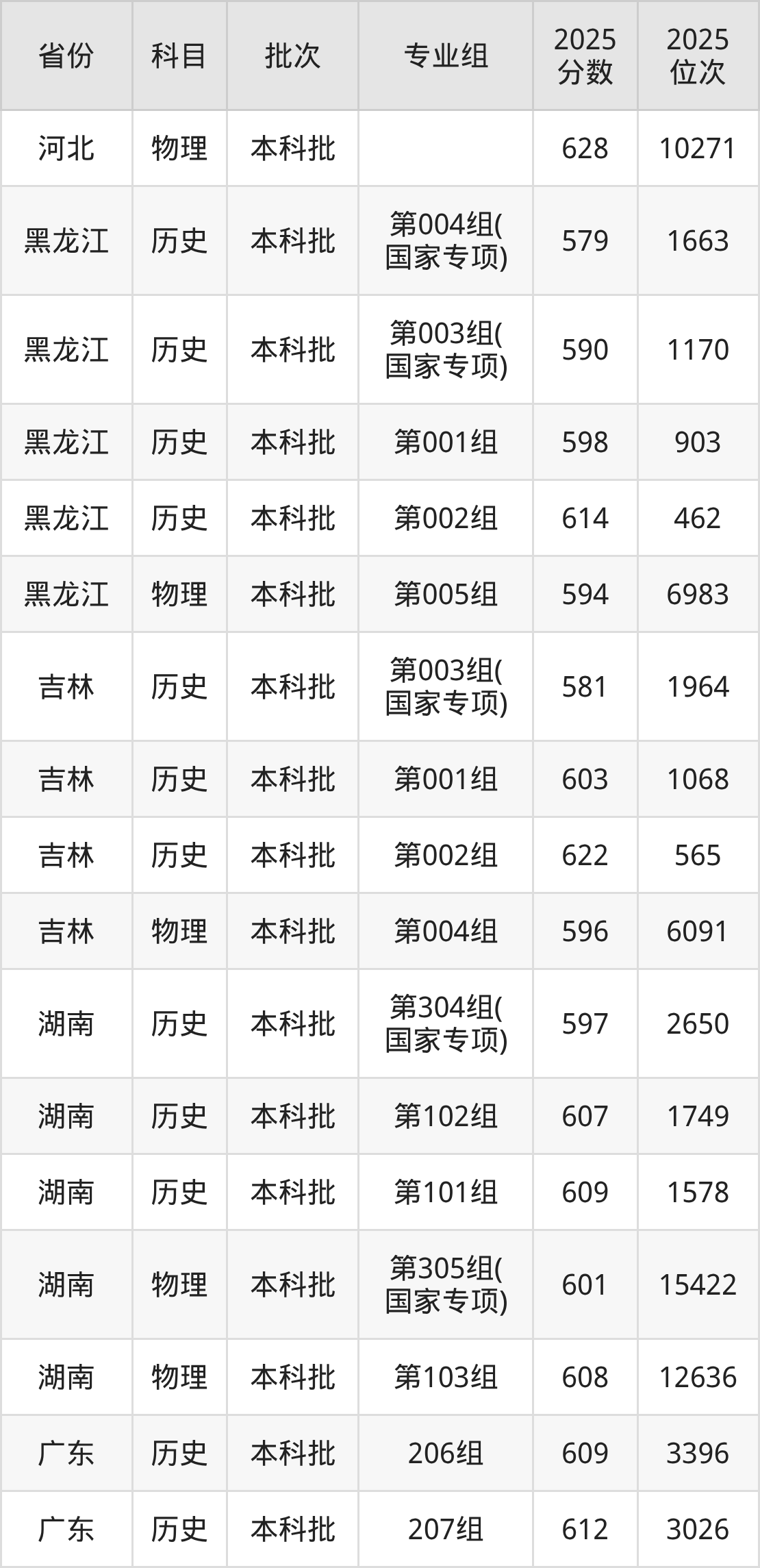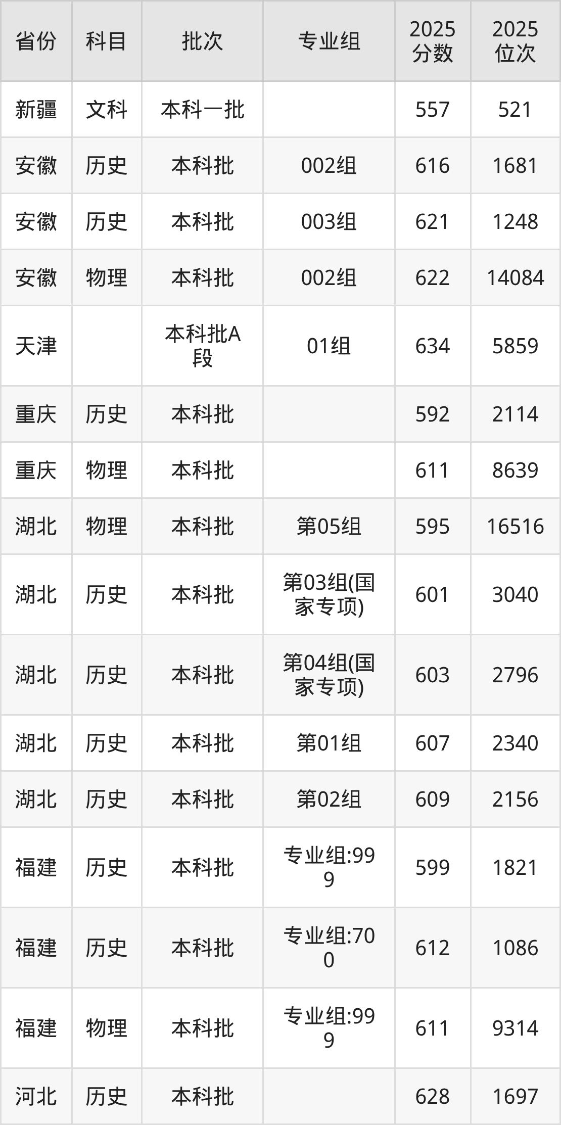 2025年在本科历史类进行招生,各专业组分数线详情如下: