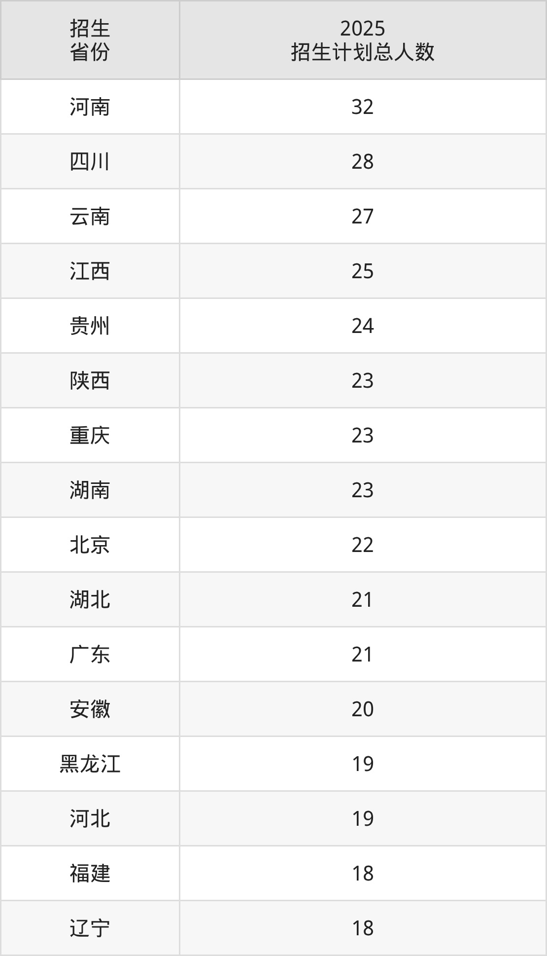 2025年中国社会科学院大学面向全国20个省市开展本科招生;招生专业共17个,招生人数共418人。2025年在北京市招生计划总人数是22人,其中,中国社会科学院大学在北京市招生人数最多的是历史学。中国社会科学院大学在各省具体招生人数情况如下表。