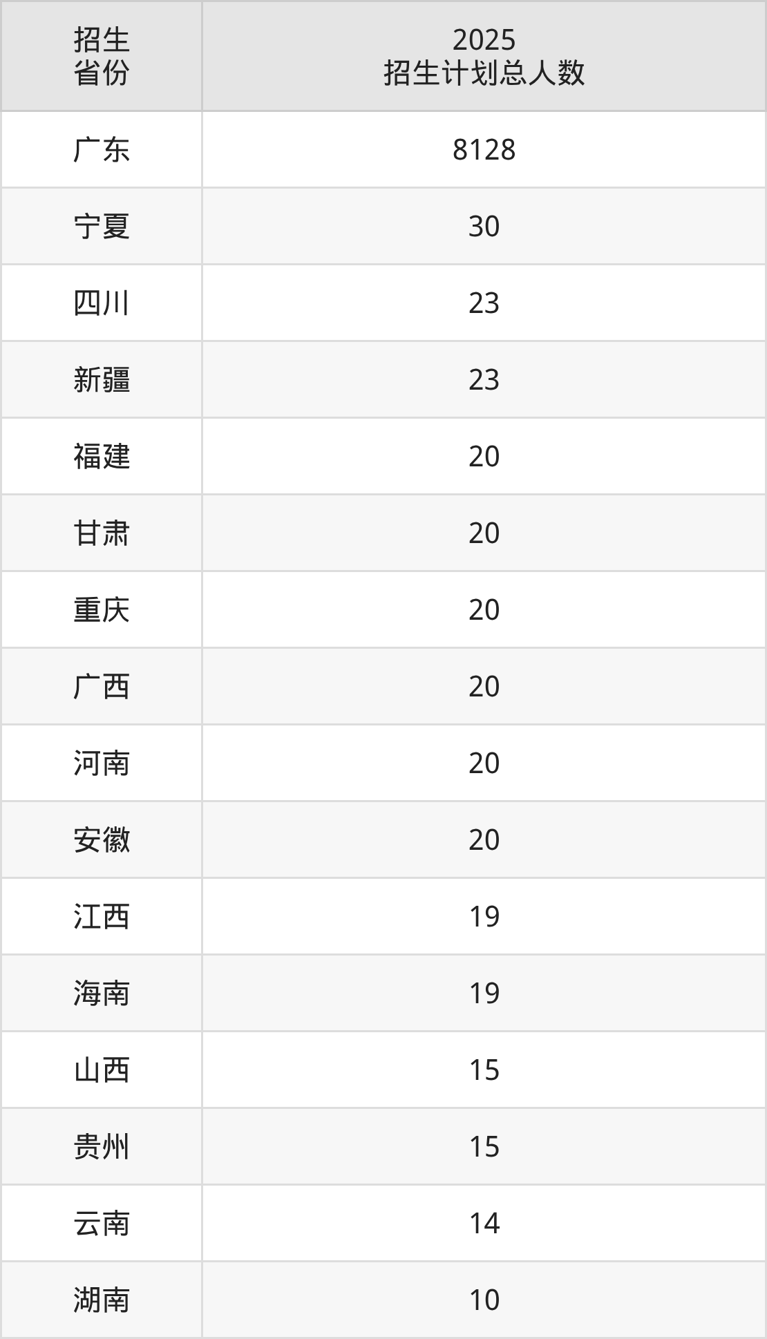2025年广东金融学院面向全国28个省市开展本科招生;招生专业共50个,招生人数共8501人。2025年在广东省招生计划总人数是8128人,其中,广东金融学院在广东省招生人数最多的是计算机科学与技术。广东金融学院在各省具体招生人数情况如下表。