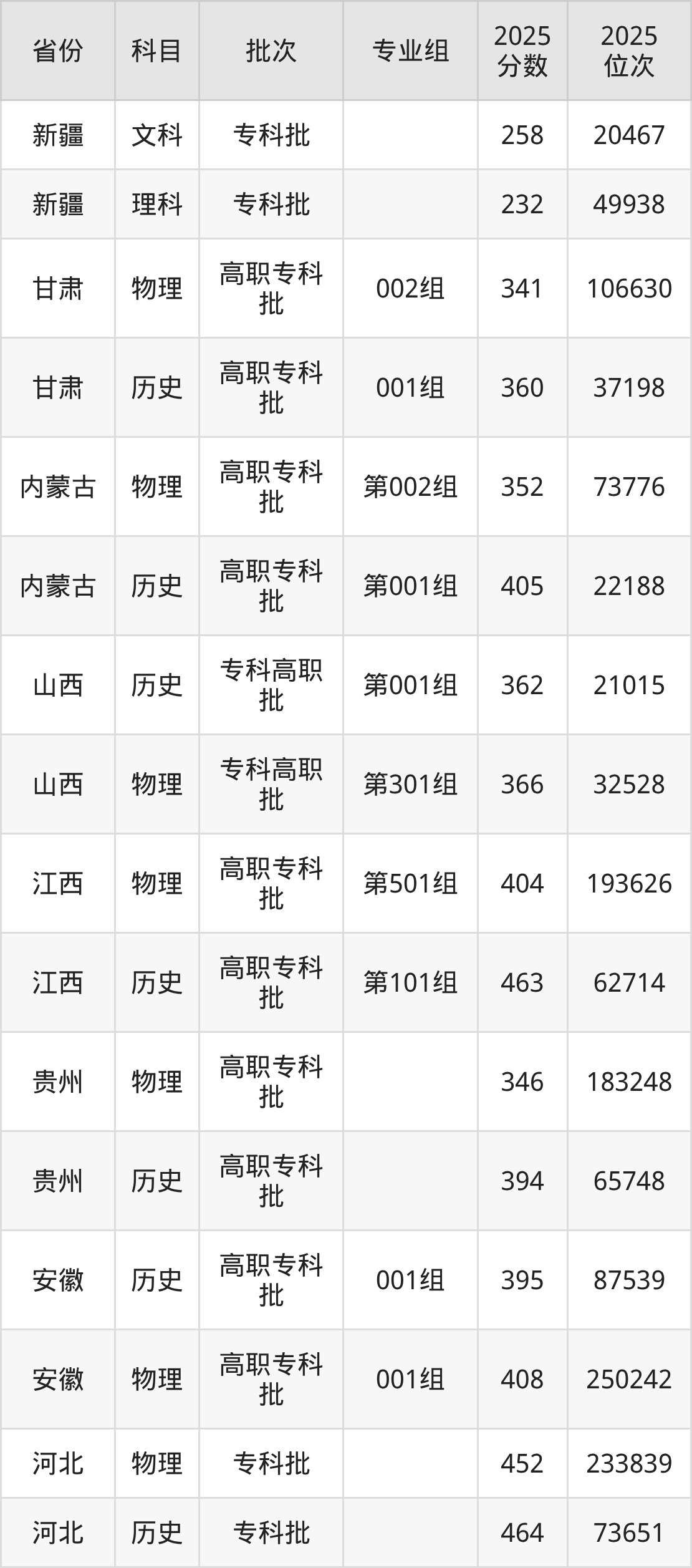 普通类专科物理类最低404分,专科历史类最低463分
