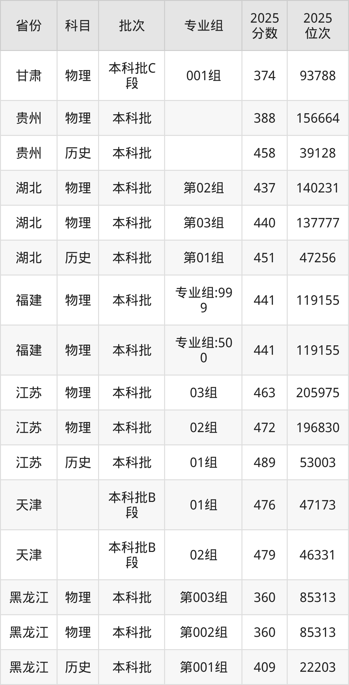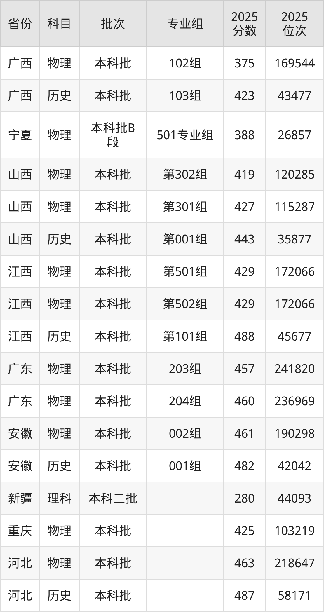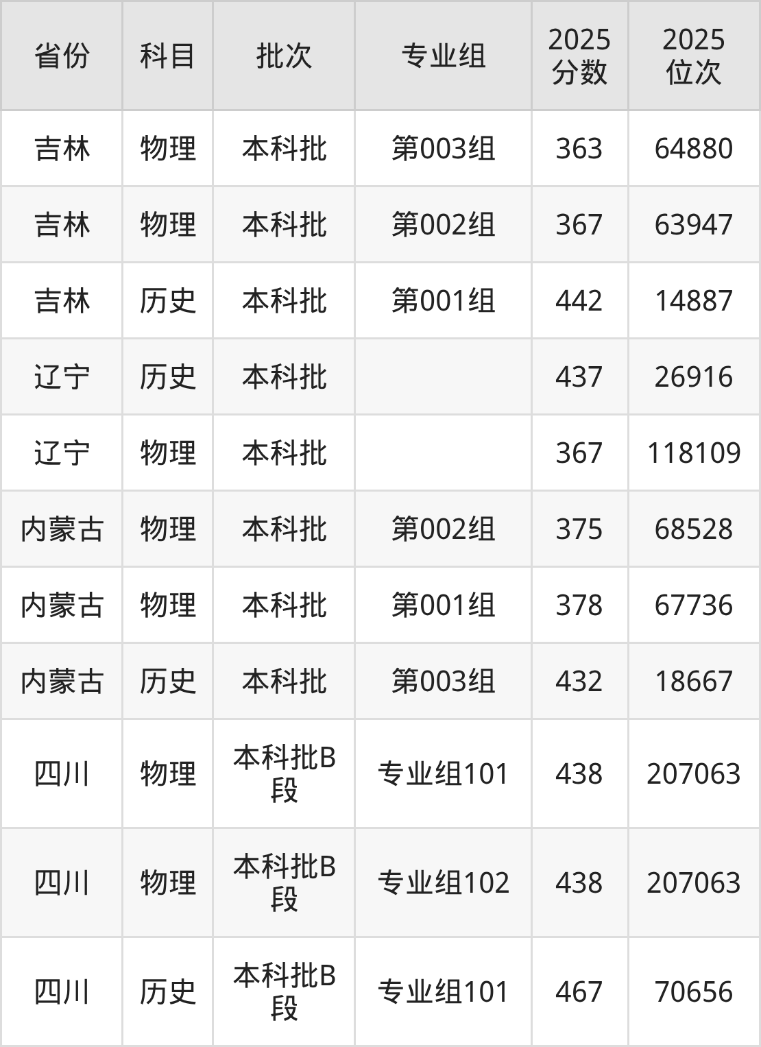 2025年在本科物理类进行招生,各专业组分数线详情如下: